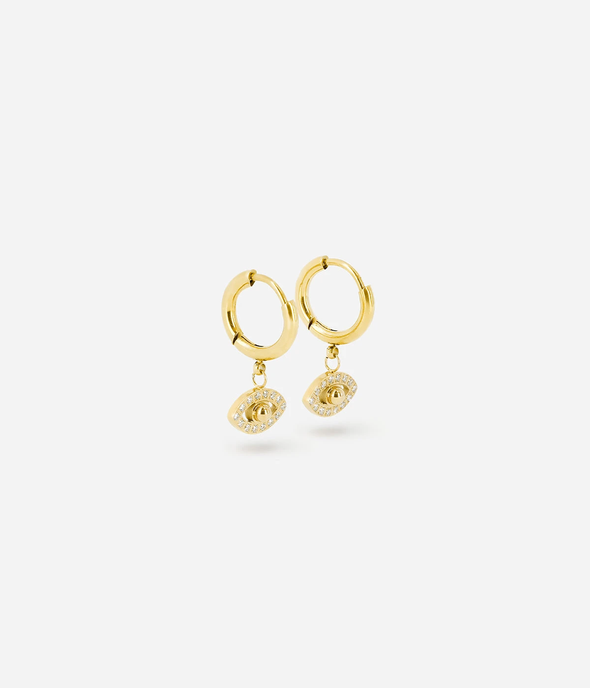 Boucles dâoreilles en acier dorĂ© Ă l’or fin sur lesquelles sont attachĂ©es des yeux protecteurs entourĂ©s de zirconiums brillants.