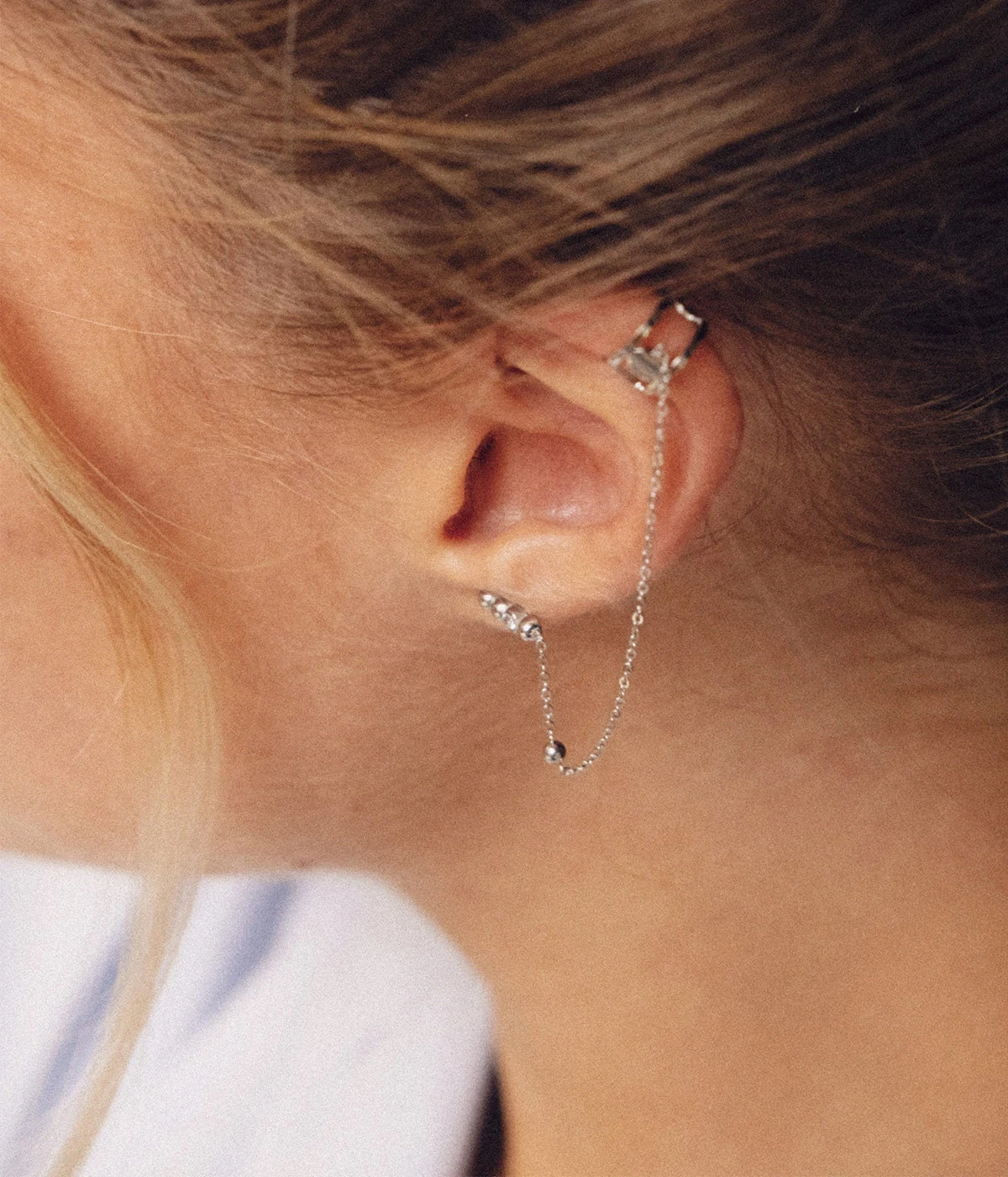 Boucles d’oreilles en acier uni ou dorĂ© dont la premiĂšre partie est sertie d’un zirconium et dont la deuxiĂšme se dĂ©cline en un earcuff enfilable directement sur le lobe.