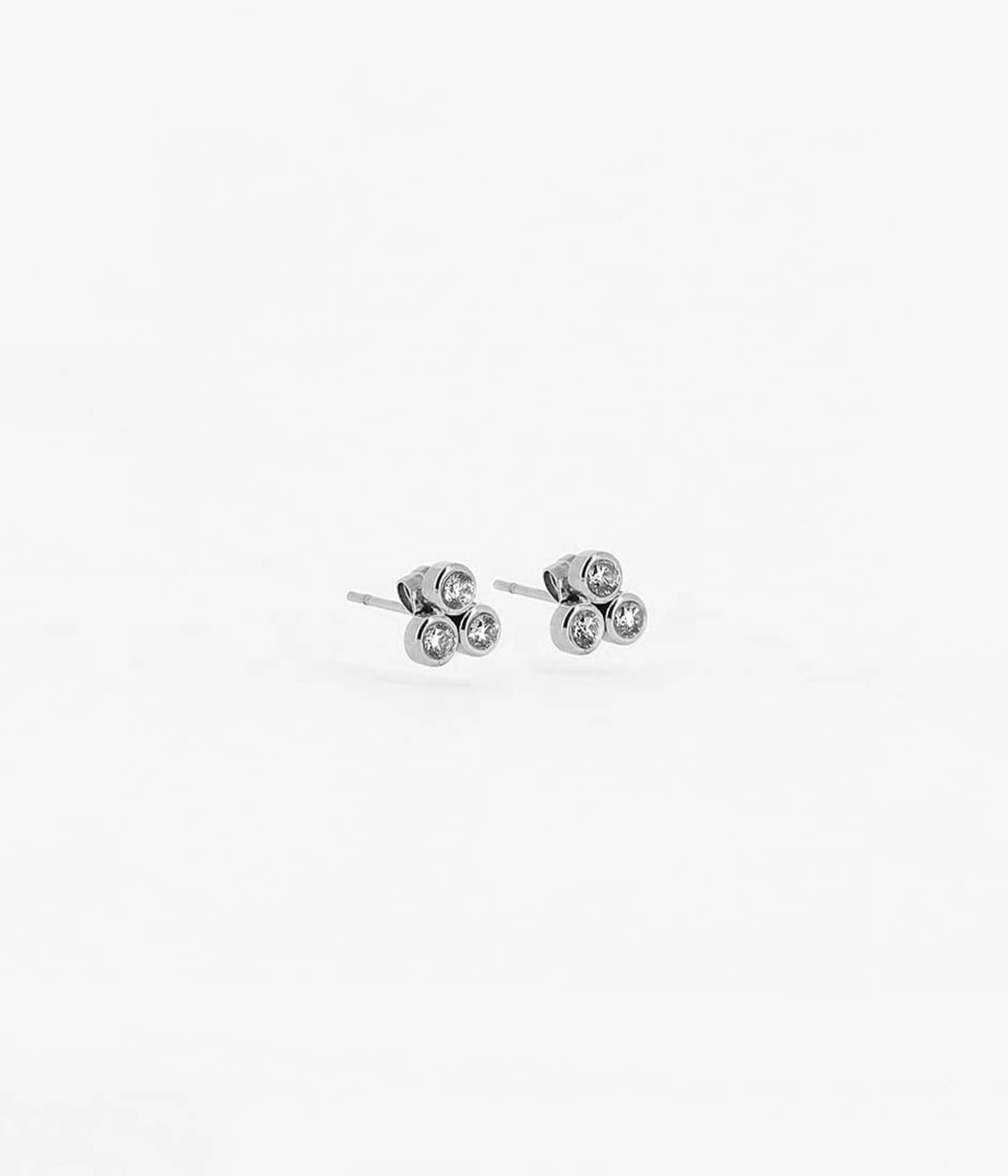 Mini boucles d’oreilles puces en acier dorĂ© Ă l’or fin formant une trilogie de zirconiums ou de pierres fines en cabochons.