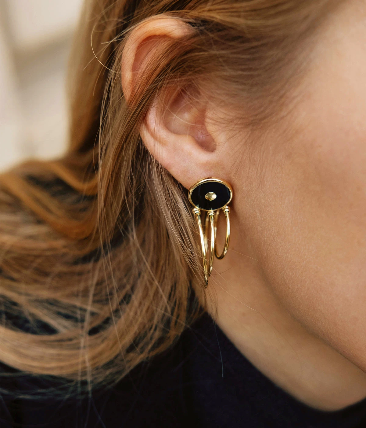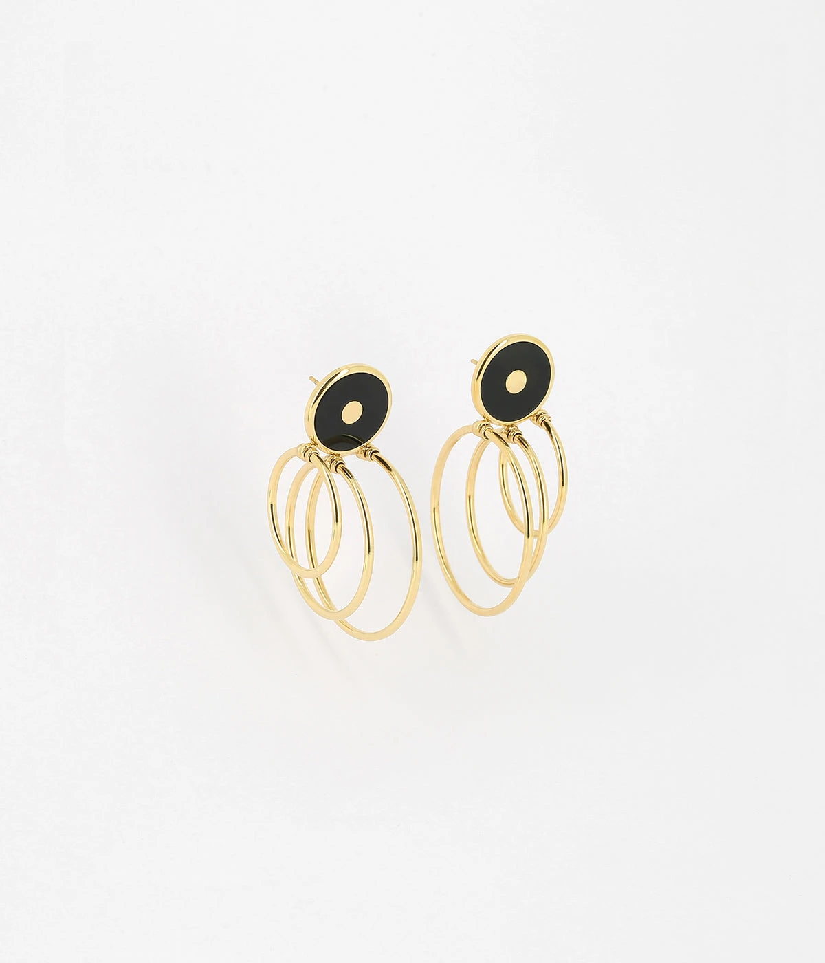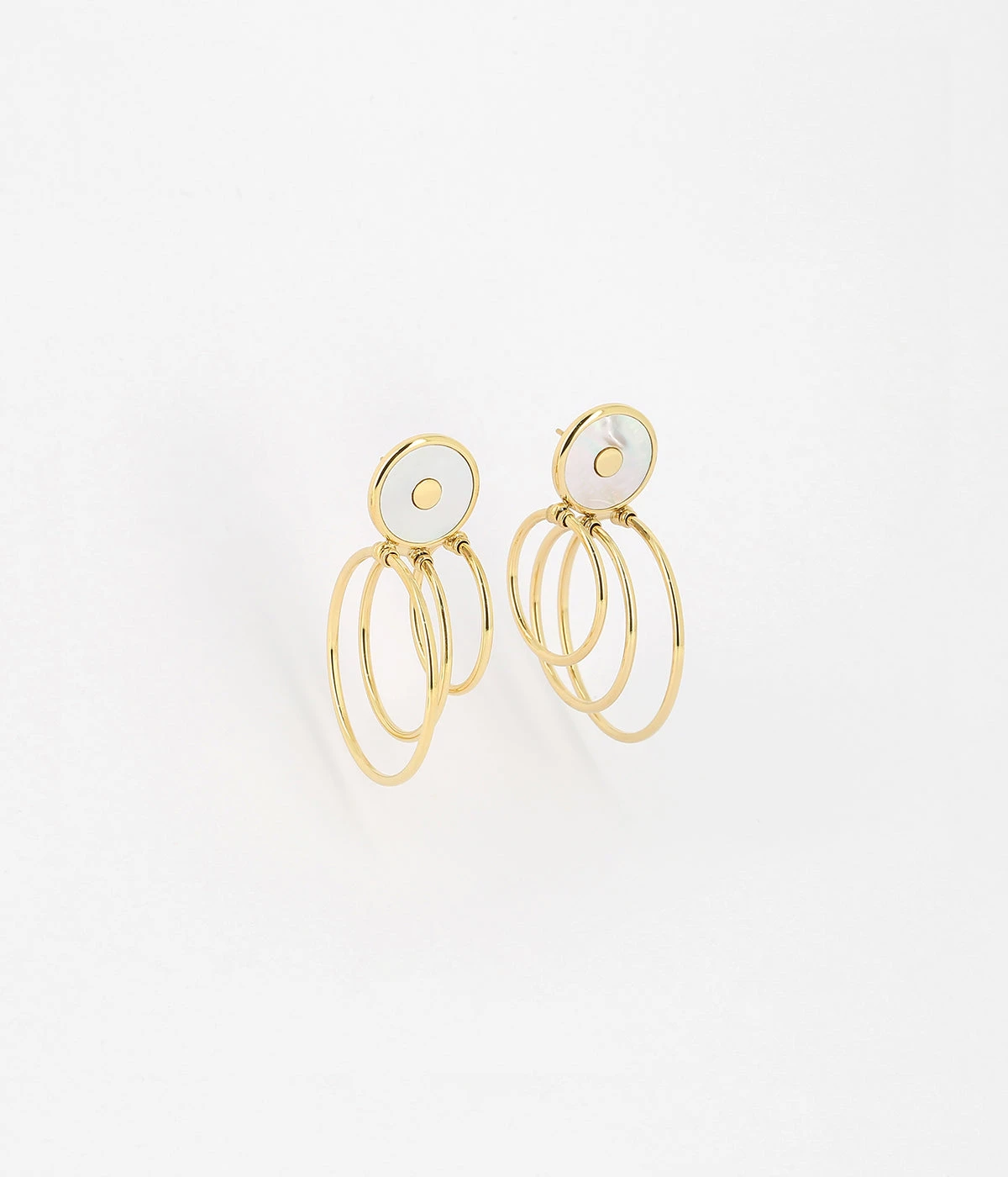 Boucles d’oreilles en acier dorĂ© Ă l’or fin sur lesquelles trois anneaux de tailles diffĂ©rentes sont attachĂ©s Ă un mĂ©daillon en nacre.