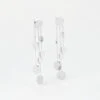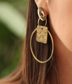 Boucles d’oreilles longues en acier uni ou doré à l’or fin. Éloge du carré martelé dans le cercle, ces boucles sont une association géométrique très contemporaine.