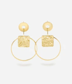 Boucles d’oreilles longues en acier uni ou doré à l’or fin. Éloge du carré martelé dans le cercle, ces boucles sont une association géométrique très contemporaine.