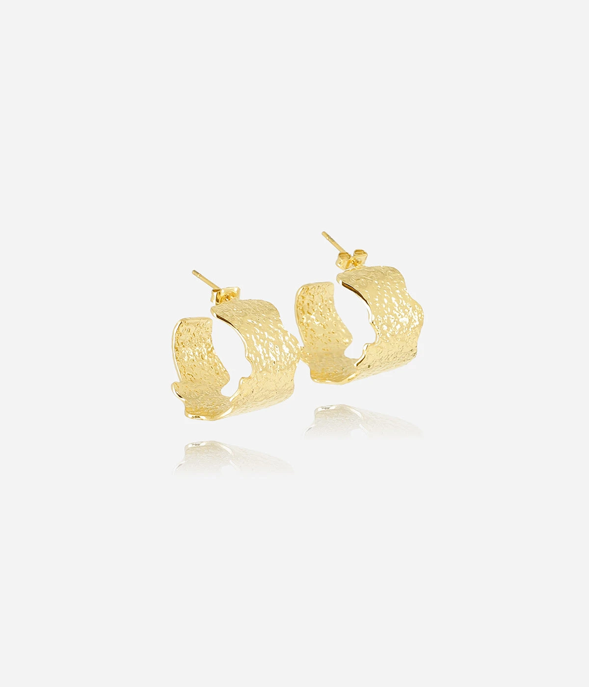 Boucles d’oreilles martelĂ©es en acier dorĂ© Ă l’or fin aux inspirations incas.