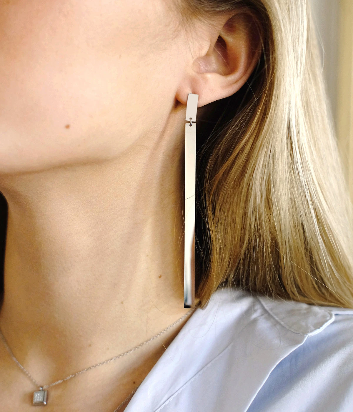 Boucles d’oreilles longues en acier uni de forme gĂ©omĂ©trique.