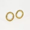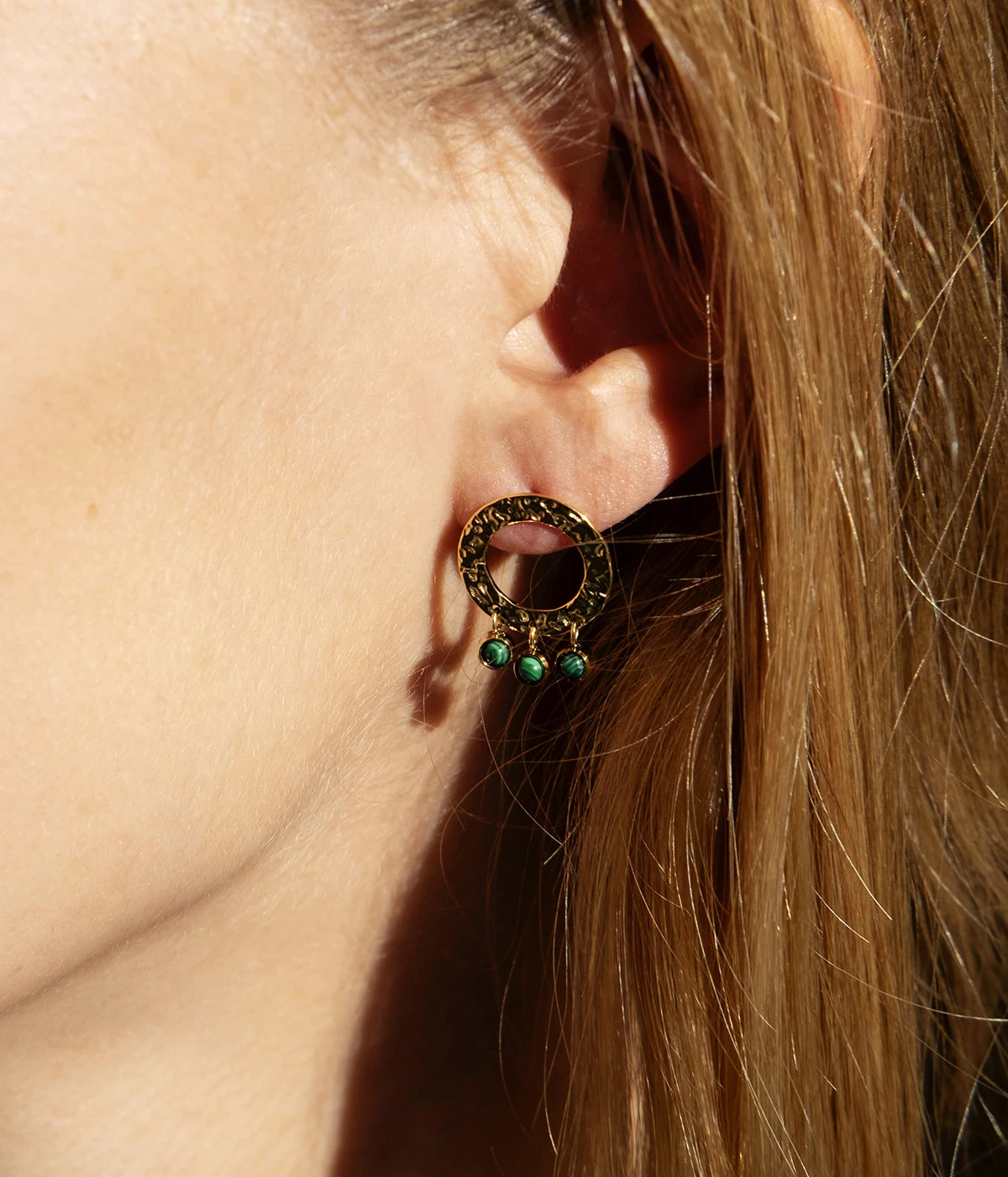 Boucles d’oreilles en acier dorĂ© Ă l’or fin martelĂ©es en forme de cercle, sur lesquelles sont suspendues des pierres naturelles.