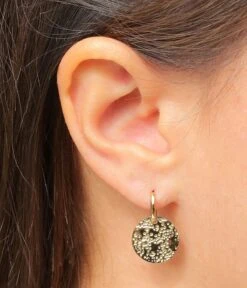 Boucles d’oreilles mini créoles en acier uni ou doré à l’or fin sur lesquelles deux pastilles de métal martelées sont attachées. Ces créoles sont très fines et collent au lobe de l’oreille pour ne laisser entrevoir que la pastille de métal lorsqu’elles sont portées.