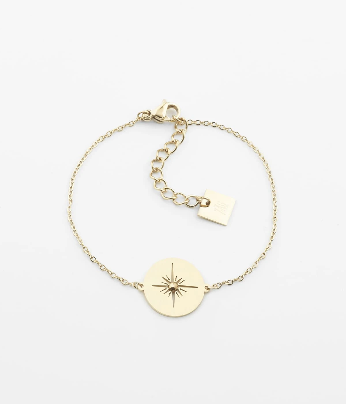 Bracelet chaînette en acier uni ou doré à l’or fin. Une médaille centrale est finement gravée d’un motif représentant les quatre points cardinaux.