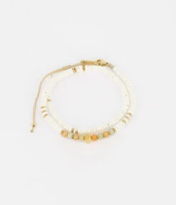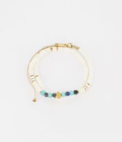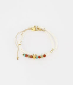 Bracelet cordon ajustable sur lequel sont enfilĂ©es des pierres de couleurs parsemĂ©s de motifs d’acier dorĂ©.