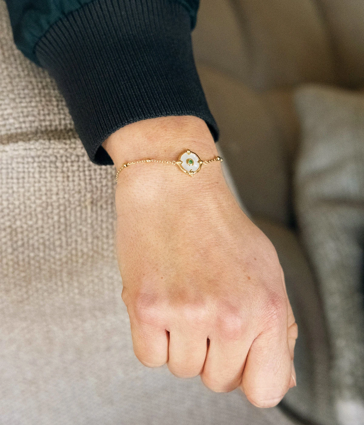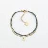 Bracelet en acier dorĂ© Ă l’or fin sur lequel une pastille colorĂ©e est attachĂ©e.