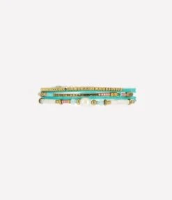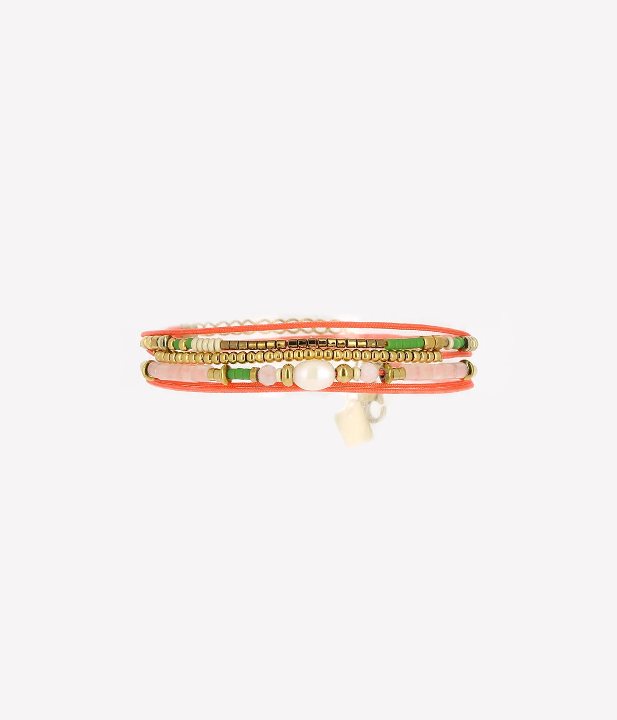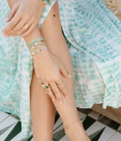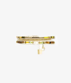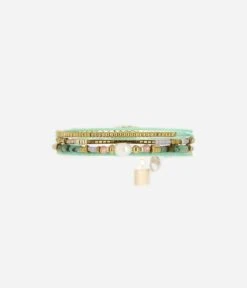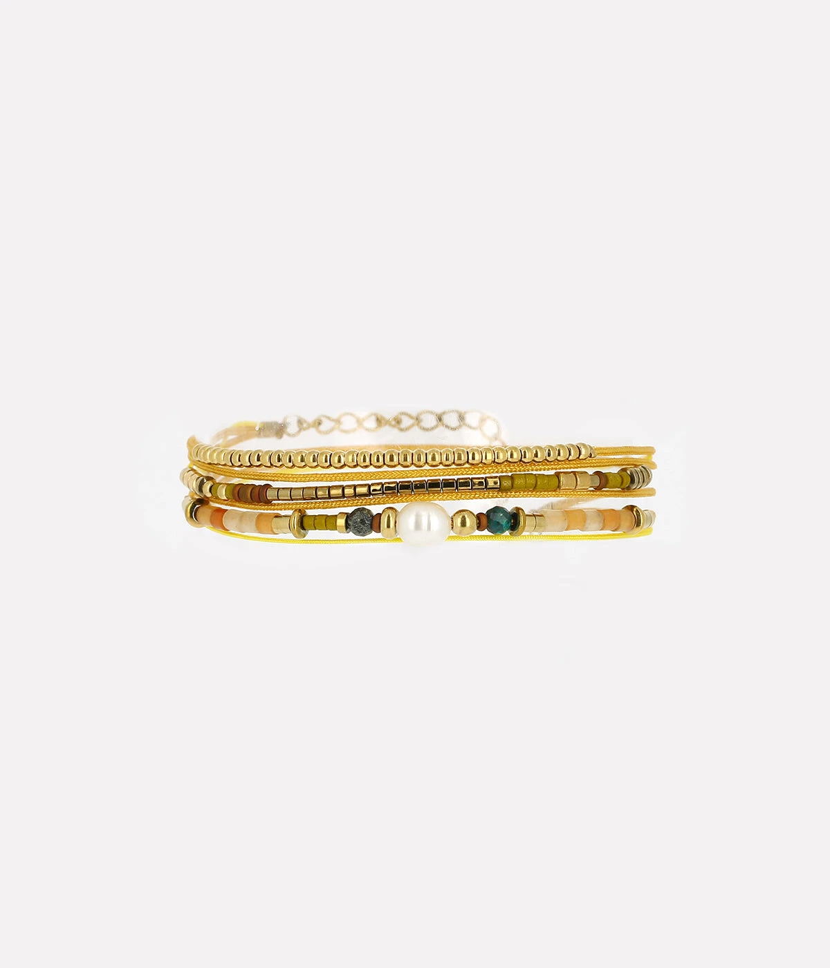 Bracelet multi-rang en coton naturel sur lequel sont enfilĂ©es des pierres naturelles et des boules en acier dorĂ© Ă l’or fin.