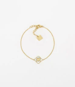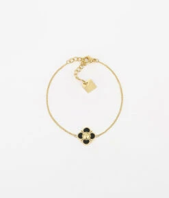 Bracelet en acier uni ou doré à l’or fin. Un petit trèfle à quatre feuilles est orné de pierres naturelles et d’un petit carré doré au centre.