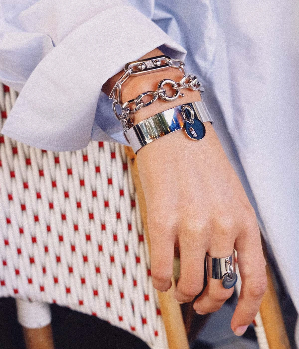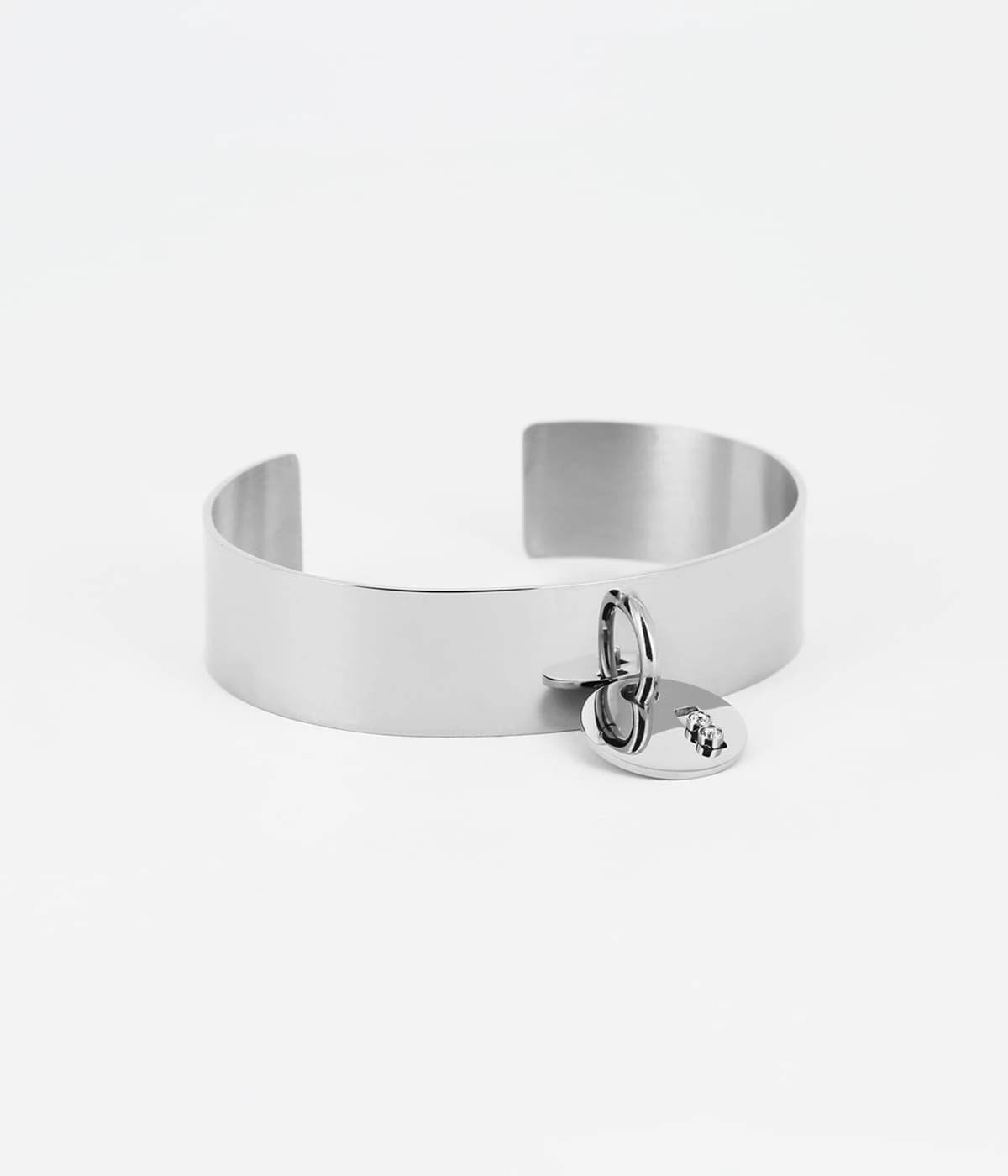 Bracelet jonc en acier uni ou dorĂ© Ă l’or fin sur lequel est attachĂ© une pampille dotĂ© de deux zirconiums.