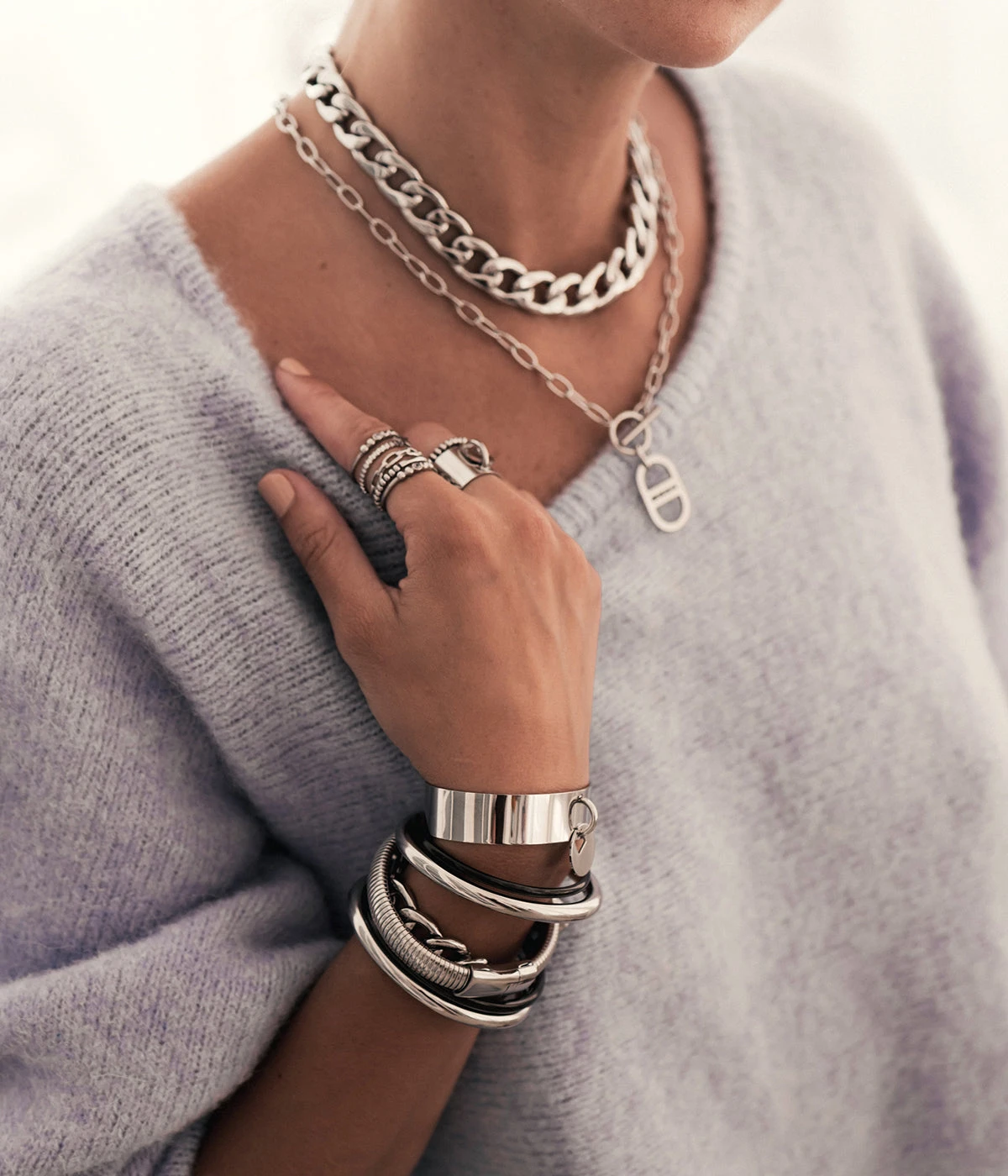 Bracelet jonc onc en acier uni ou dorĂ© Ă l’or fin sur lequel est suspendu une pampille.
