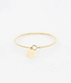 Bracelet jonc en acier uni ou dorĂ© Ă l’or fin sur lequel est attachĂ© une petite mĂ©daille gravĂ©e du mot « Chance ».