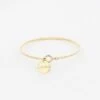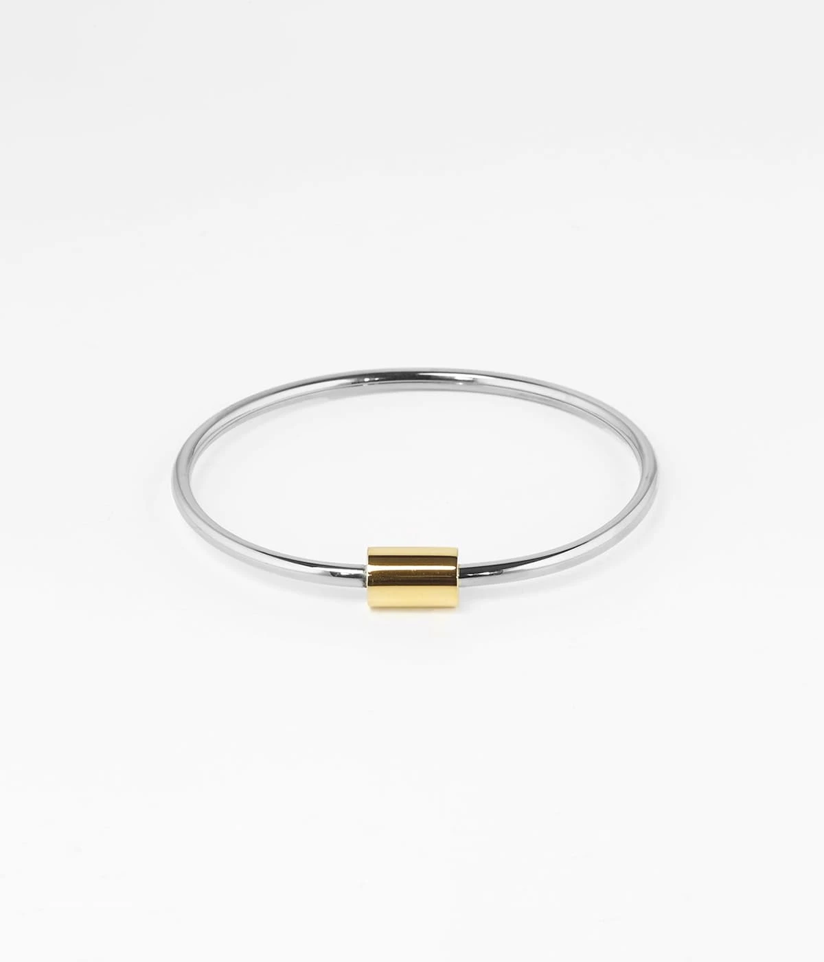 Bracelet jonc en acier uni ou dorĂ© Ă lâor fin. Le mĂ©tal est Ă lâhonneur et en son centre un cylindre dorĂ© fait office de motif.