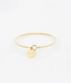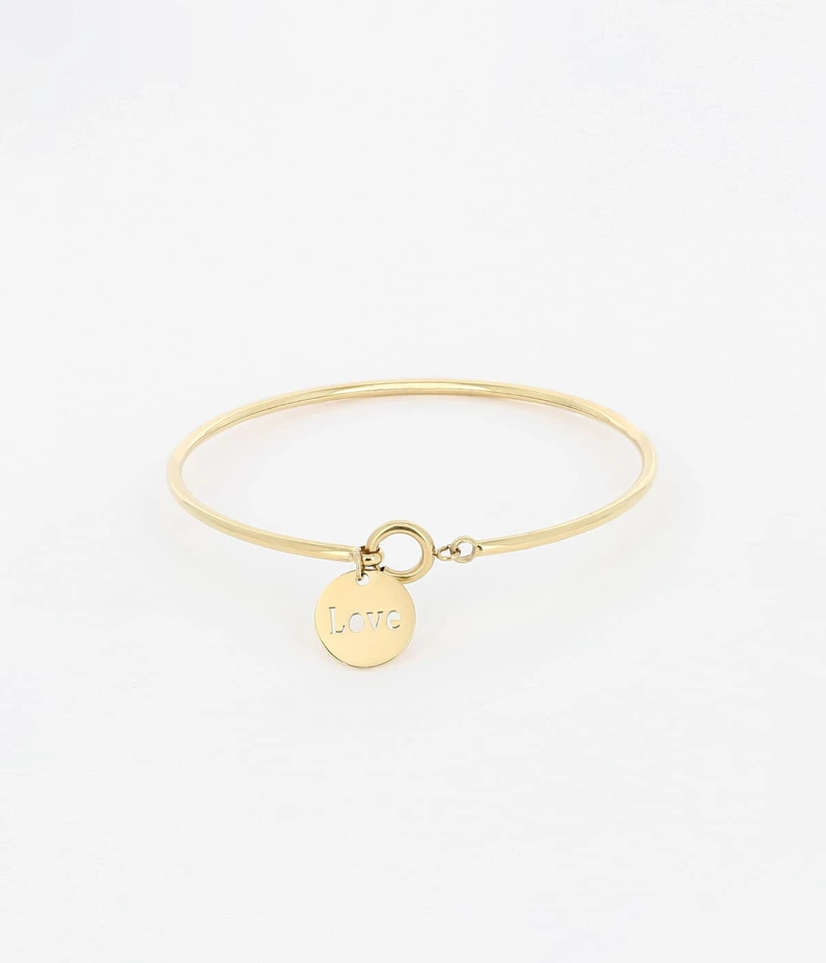 Bracelet jonc en acier uni ou dorĂ© Ă l’or fin sur lequel est attachĂ© une petite mĂ©daille gravĂ©e du mot « Love ».