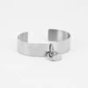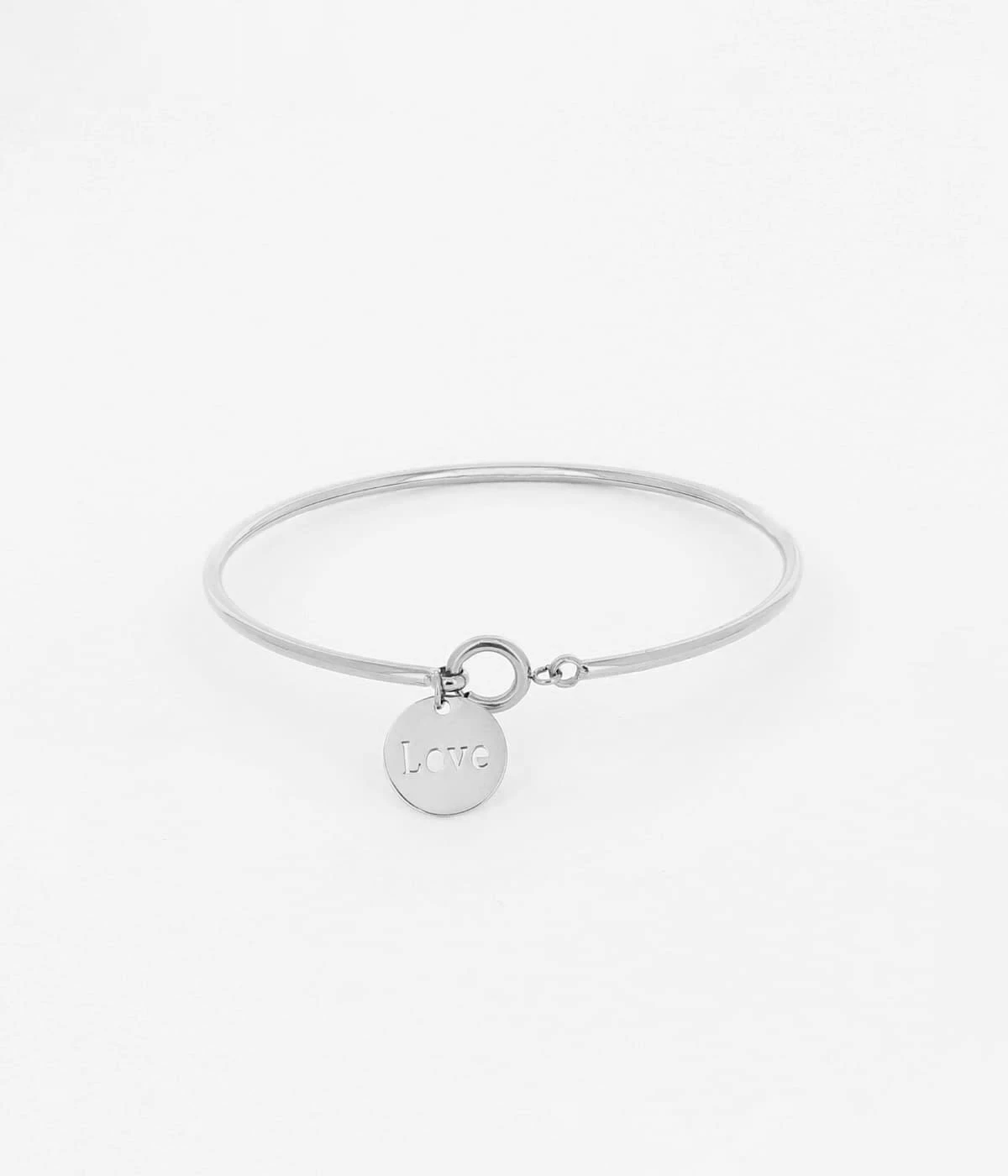 Bracelet jonc en acier uni ou dorĂ© Ă l’or fin sur lequel est attachĂ© une petite mĂ©daille gravĂ©e du mot « Love ».