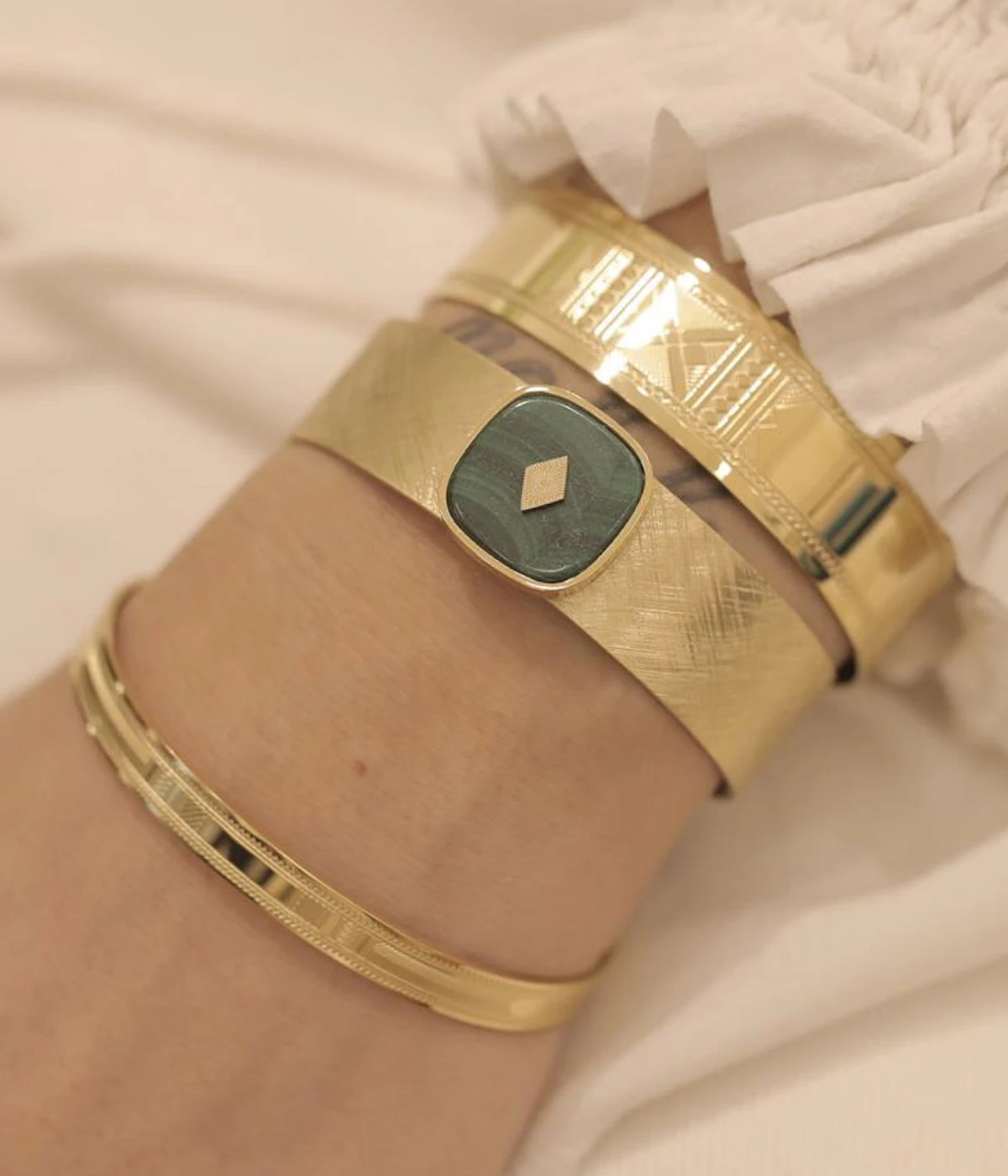Bracelet jonc en acier uni ou dorĂ© Ă l’or fin finement ciselĂ© de motifs graphiques rappelant ceux des bijoux islandais.