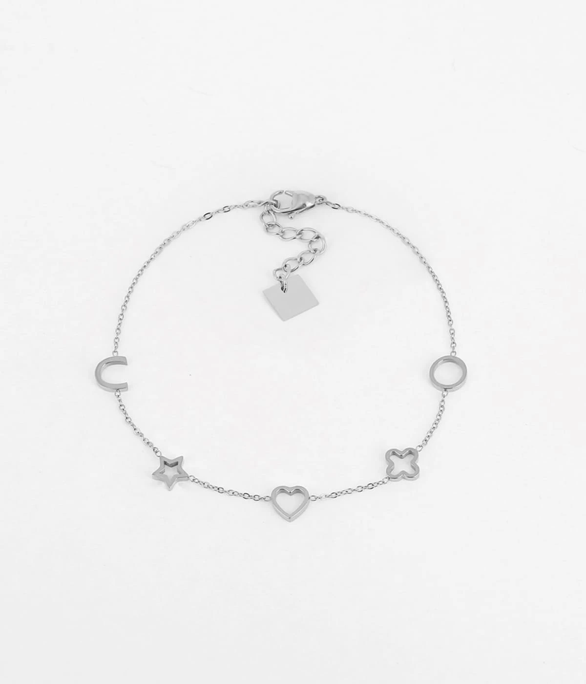 Bracelet en acier dorĂ© Ă l’or fin sur lequel sont attachĂ©s des motifs de cercle, fleur, cĹ“ur et Ă©toile ajourĂ©es très contemporaines.