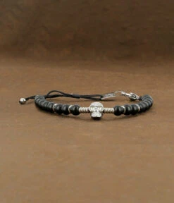 Bracelet cordon noir ajustable sur lequel sont enfilĂ©es des perles dâonyx noir. Un motif « tĂȘte de mort » en acier uni martelĂ© sâajuste sur le haut du poignet.