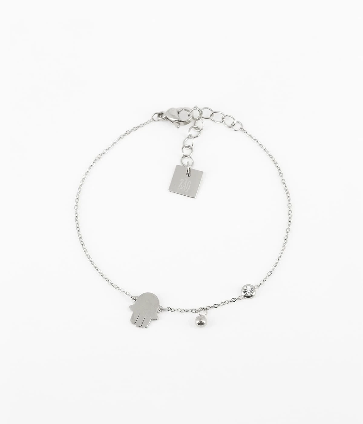 Bracelet chaĂźne en acier uni ou dorĂ© Ă lâor fin sur lequel est attachĂ© un motif ciselĂ© en forme de petite main et un zirconium serti. Le motif de ce bracelet est un signe universel de protection depuis des siĂšcles.