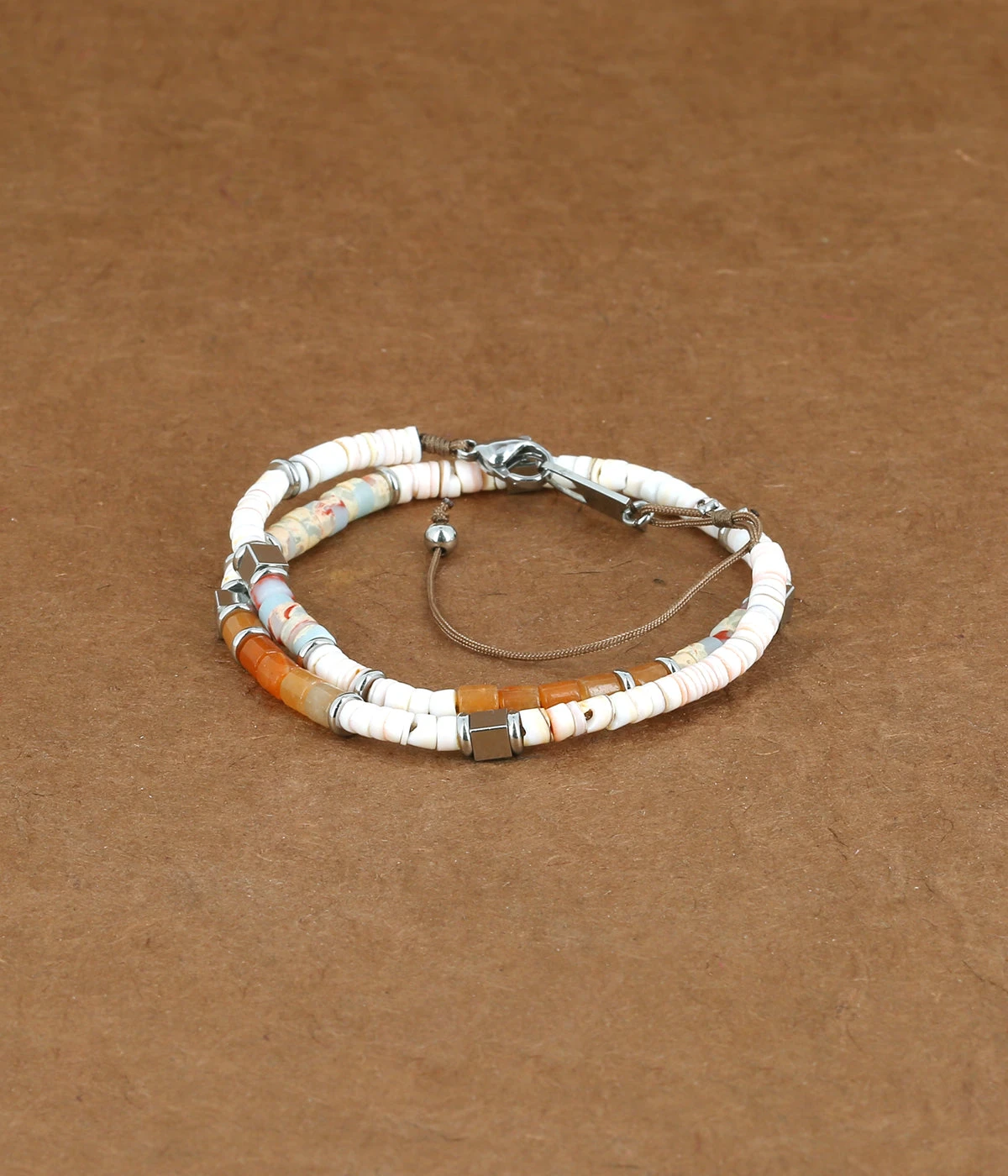 Dans un mĂ©lange de blanc et d’orangĂ©, ce bracelet dâinspiration « surfeur » est un incontournable de notre collection.