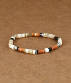 Bracelet élastique sur lequel sont enfilées des pierres fines de couleurs, parsemées de motifs de métal.