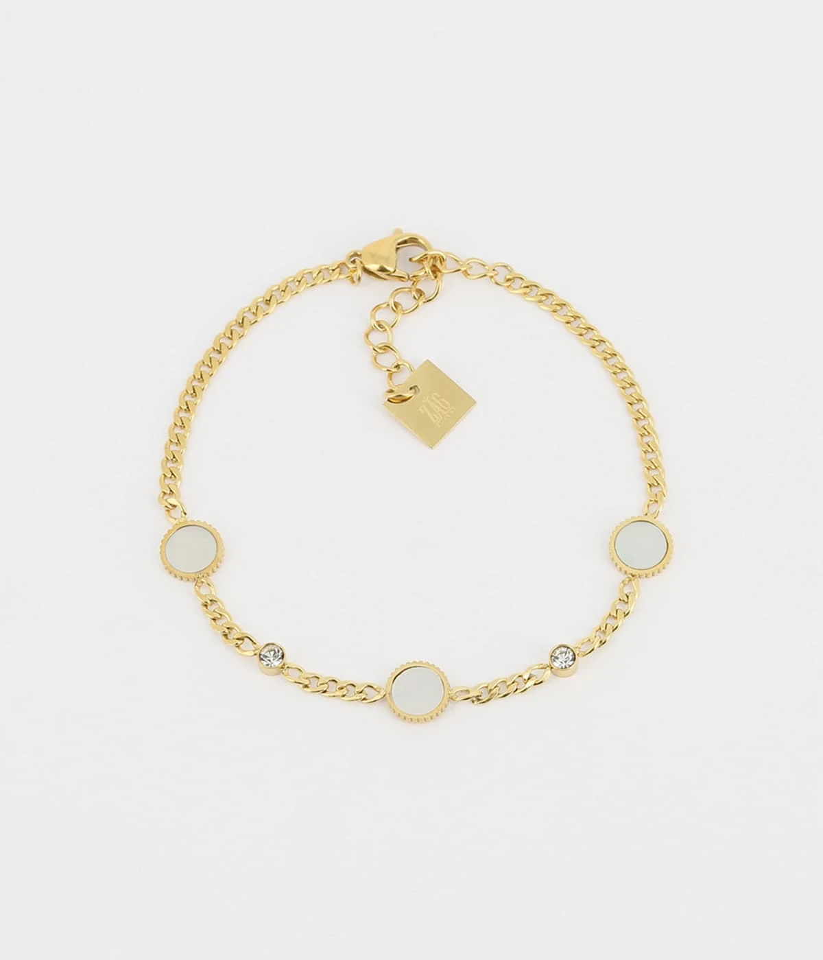 Bracelet chaĂźne gourmette en acier uni ou dorĂ© Ă l’or fin sur lequel est attachĂ©es des plaques en acier serties de nacre et de zirconiums