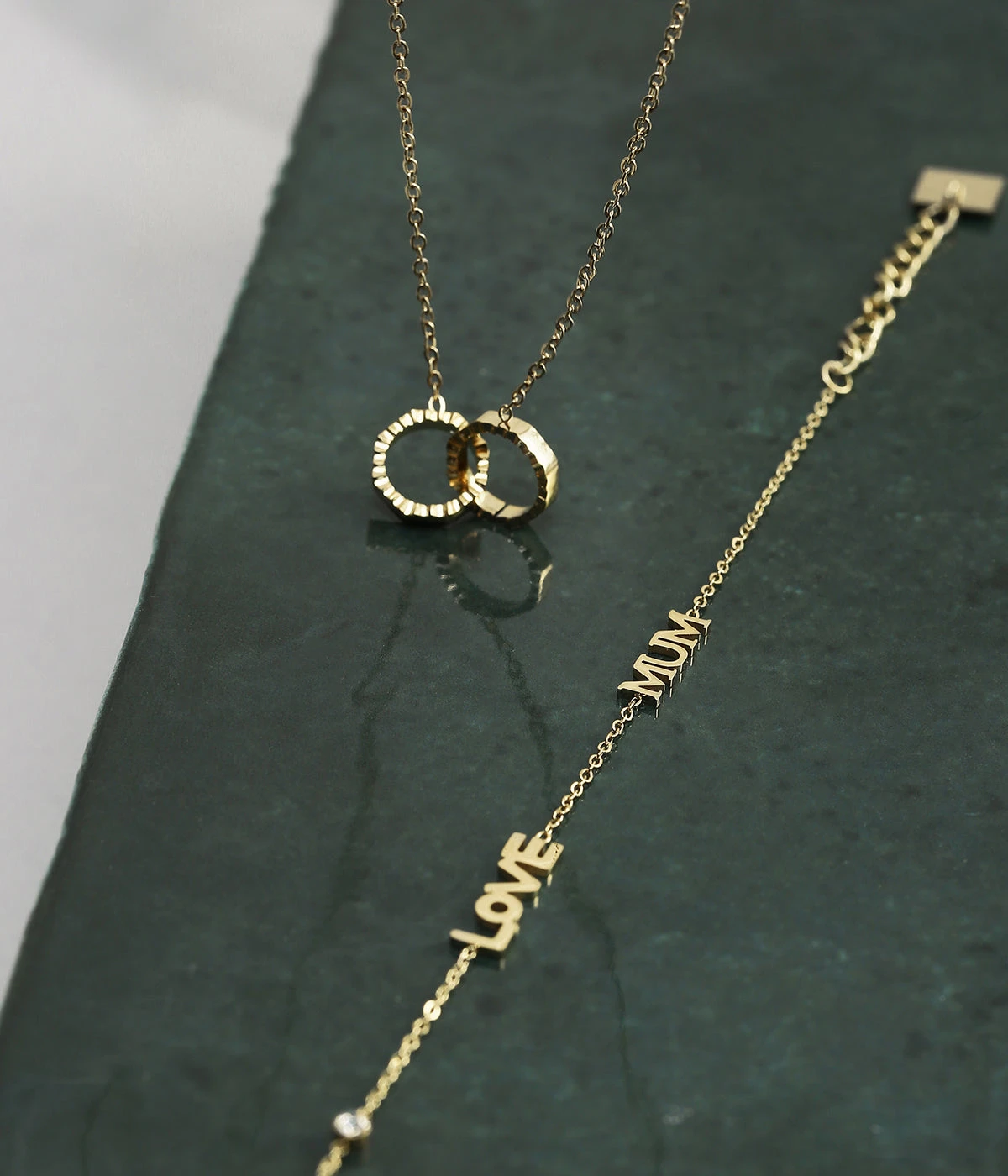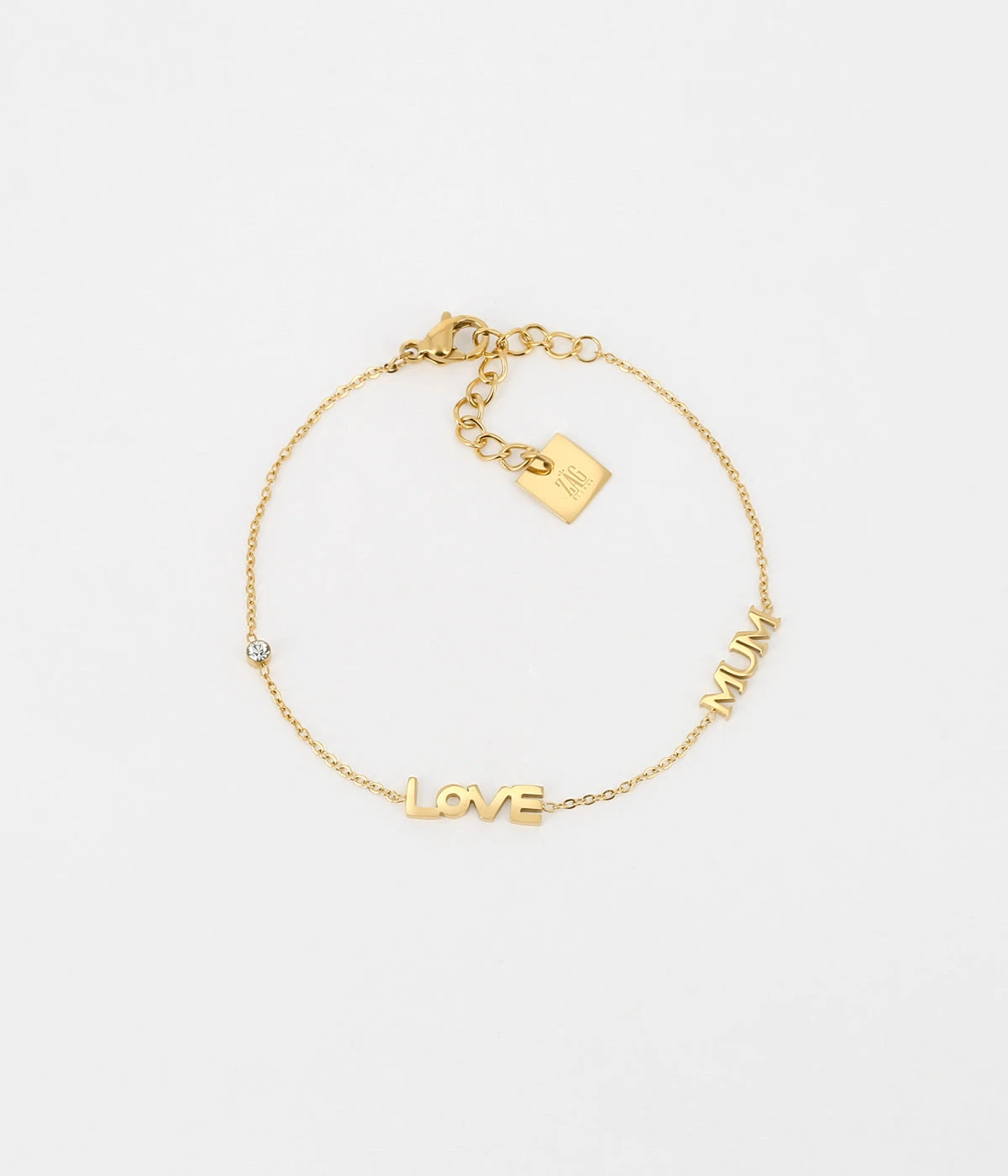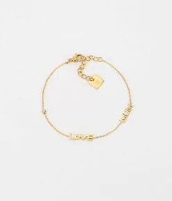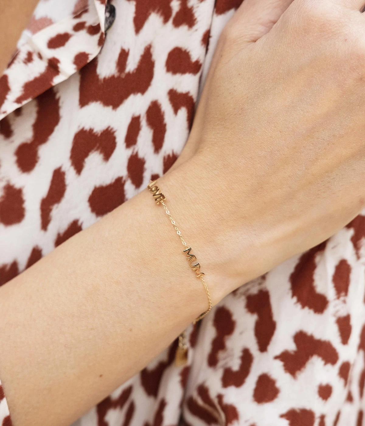 Bracelet en acier uni ou dorĂ© Ă l’or fin sur lequel est attachĂ© les mots « Love Mum » .