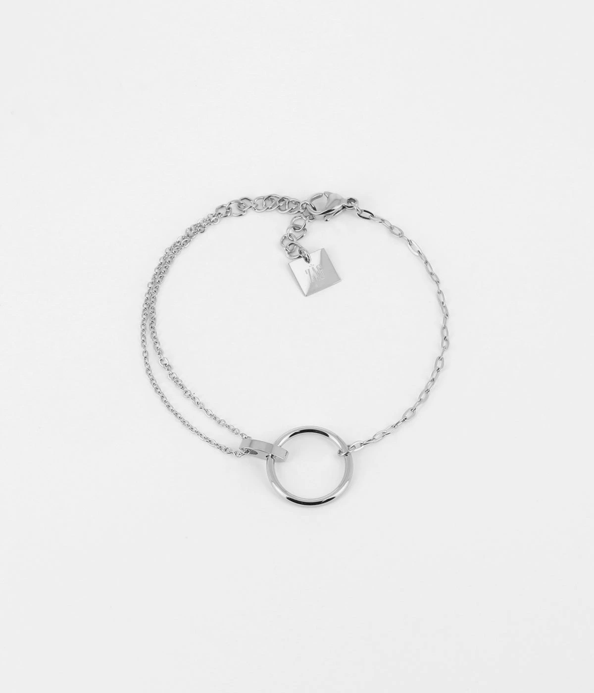Bracelet en acier uni ou dorĂ© Ă l’or fin sur lequel est suspendu un pendentif en forme de cercle.