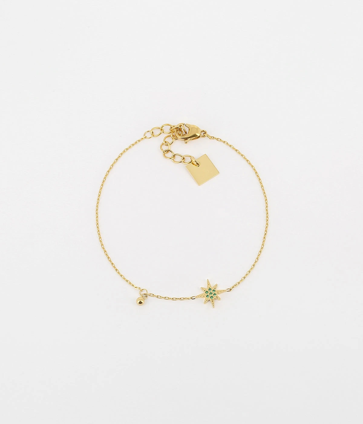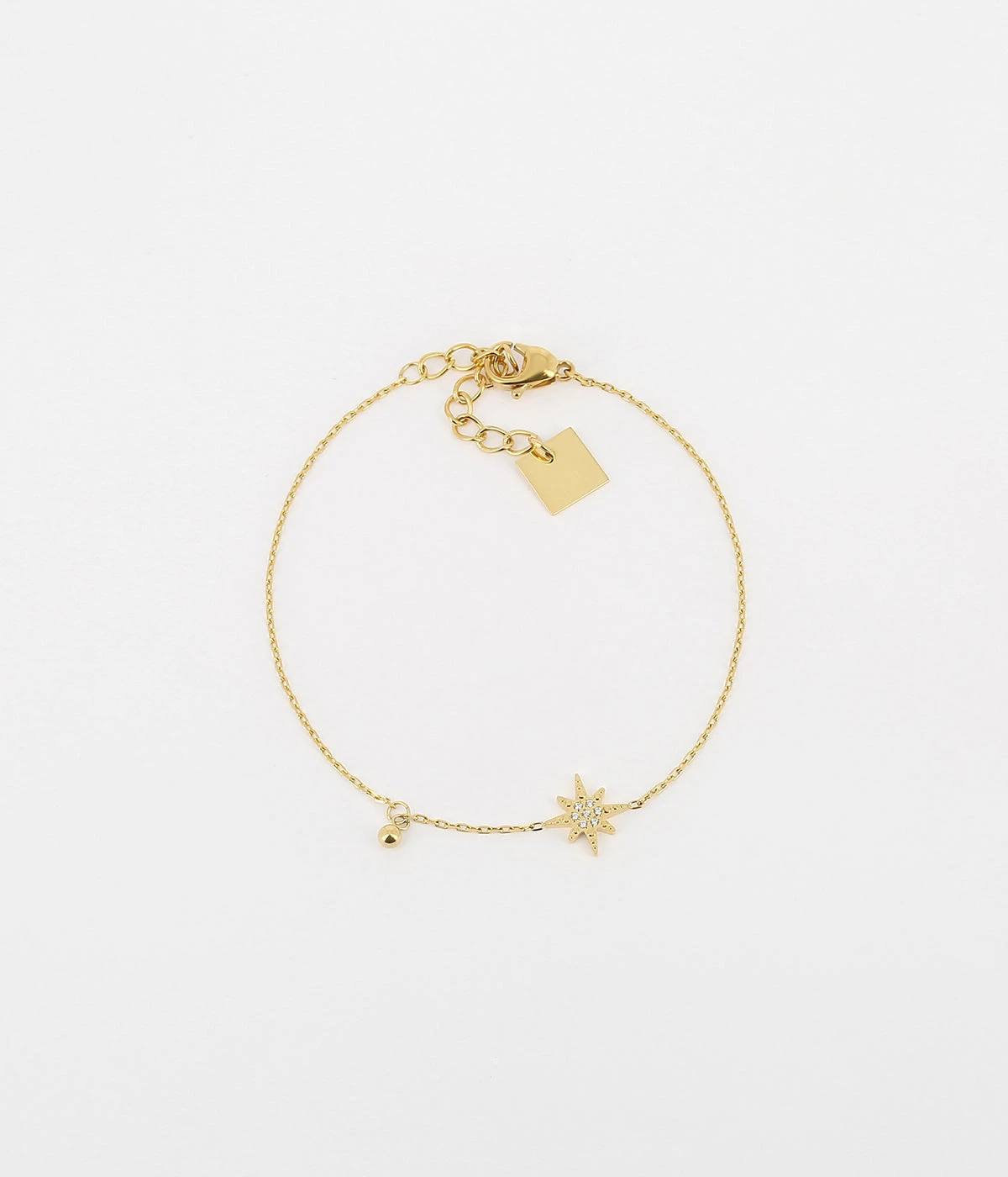Bracelet en acier dorĂ© Ă l’or fin sur lequel une Ă©toile du Nord est attachĂ©e, sertie de zirconiums. Une petite boule d’acier se trouve Ă©galement sur la chaĂźne.