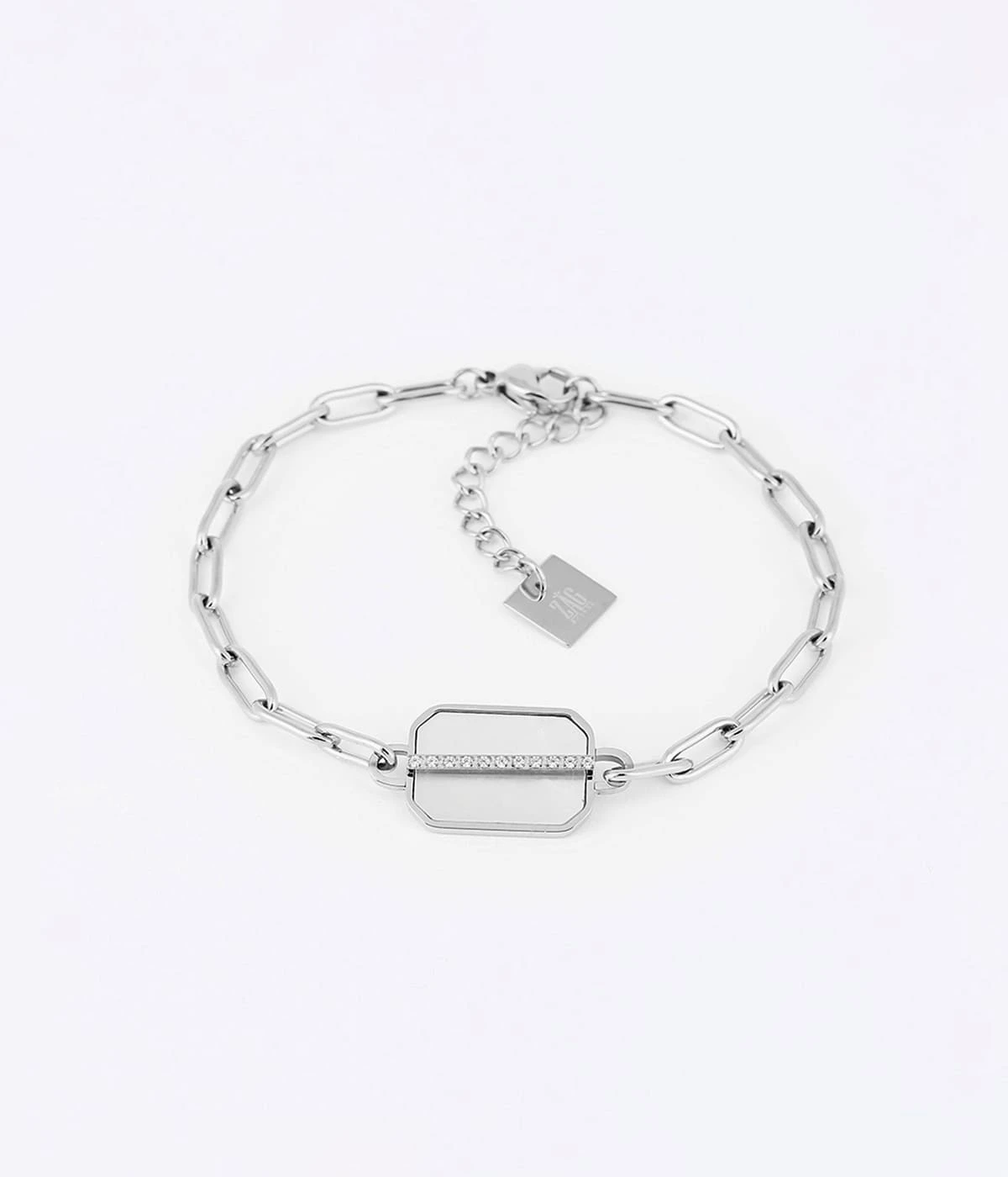 Bracelet chaĂźnette en acier uni ou dorĂ© Ă lâor fin sur lequel un rectangle de nacre serti de mĂ©tal est divisĂ© en son centre dâune baguette finement ciselĂ©e.