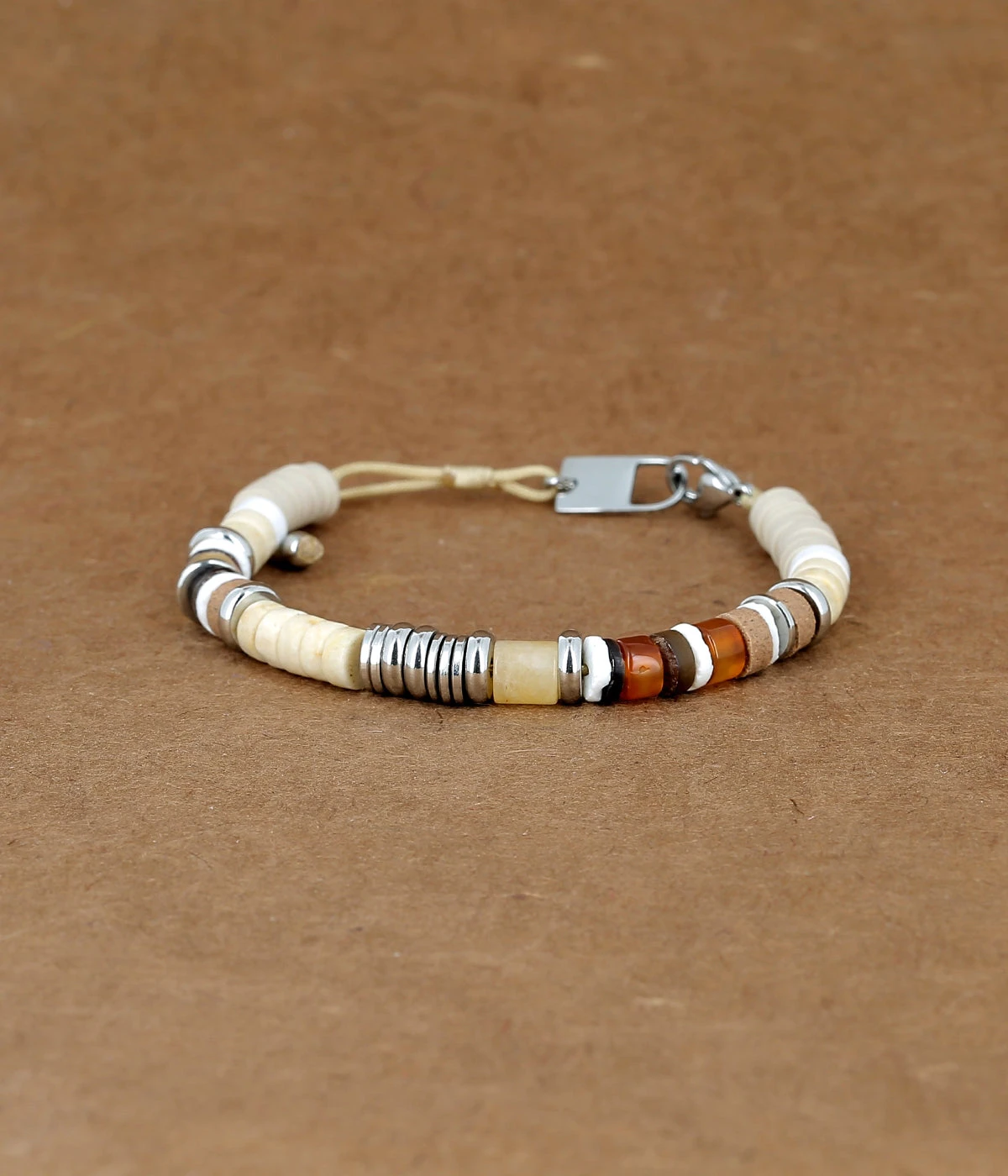 Bracelet ajustable sur lequel sont enfilées des rondelles colorées et en acier uni.