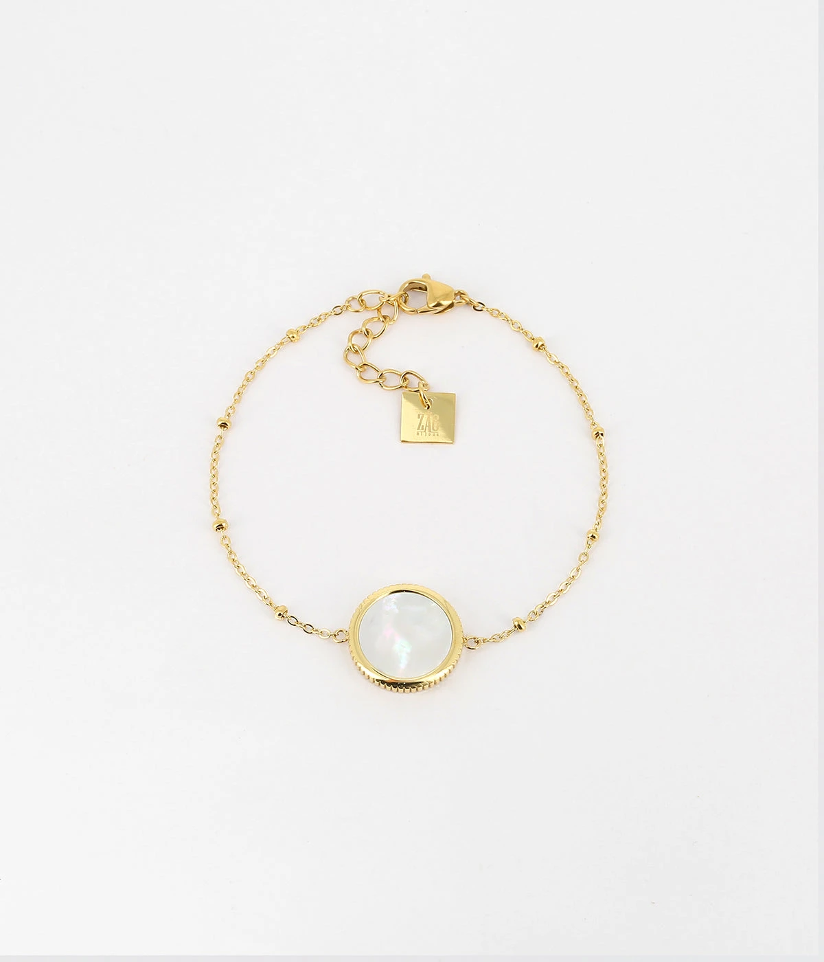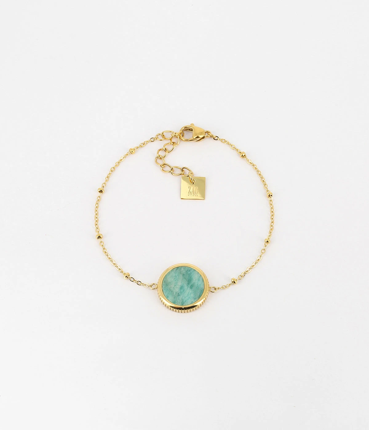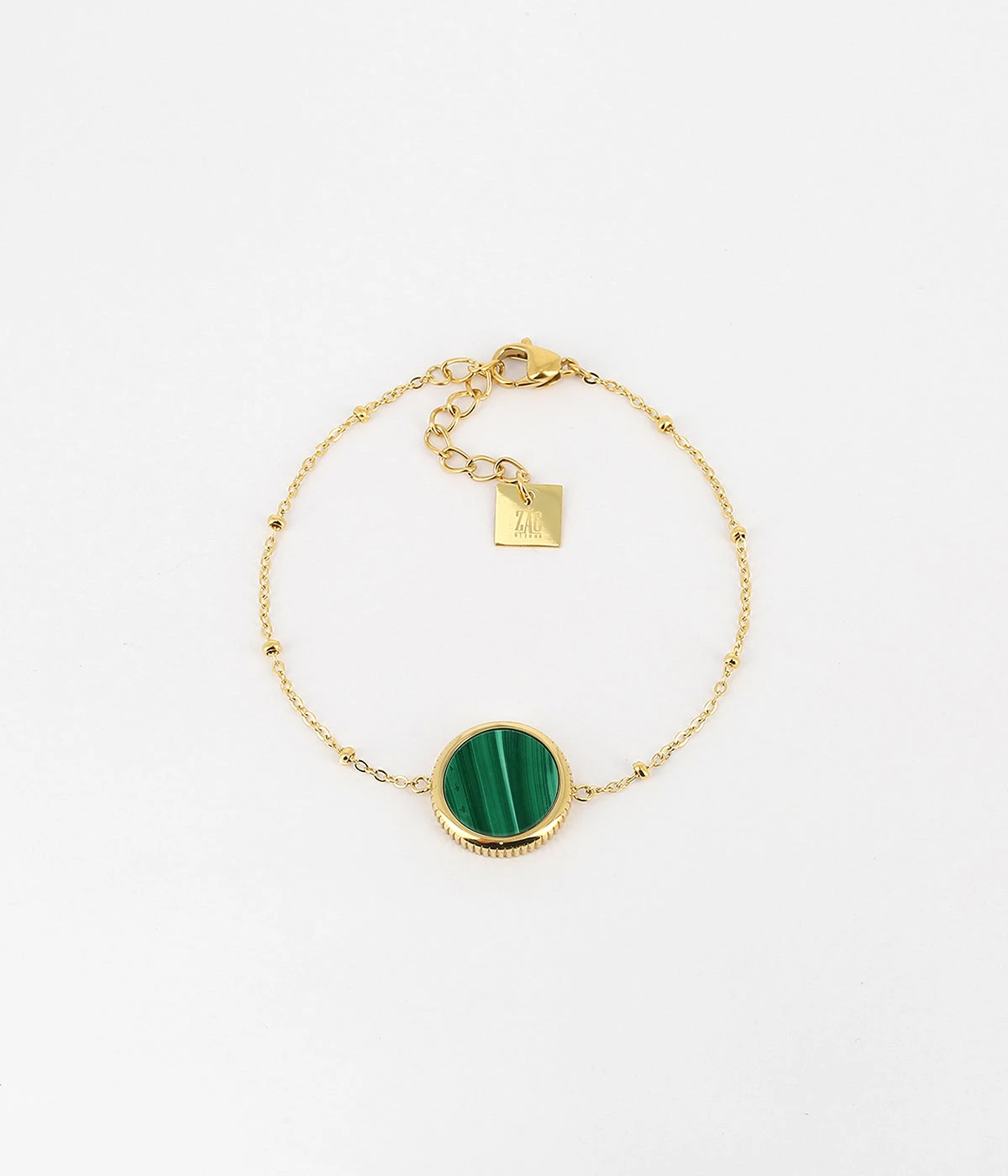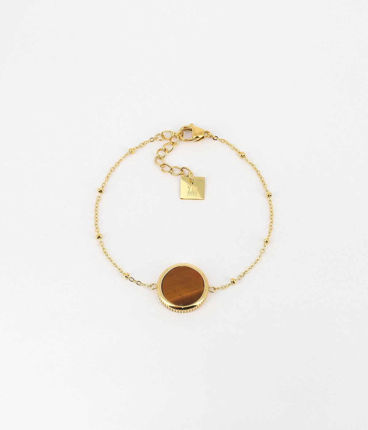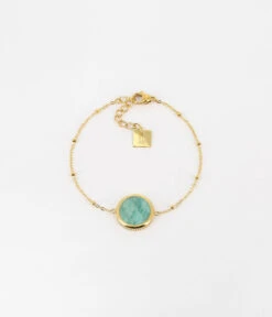 Bracelet en acier dorĂ© Ă l’or fin sur lequel est attachĂ©e une mĂ©daille constituĂ©e d’une pierre naturelle.