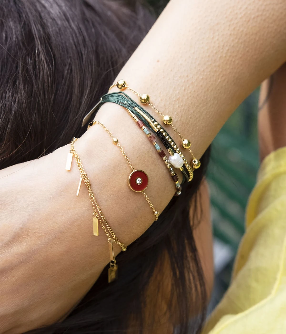 Bracelet cordons multi-rang colorĂ© sur lequel sont enfilĂ©es une perle dâeau douce et des boules d’acier dorĂ© Ă l’or fin.