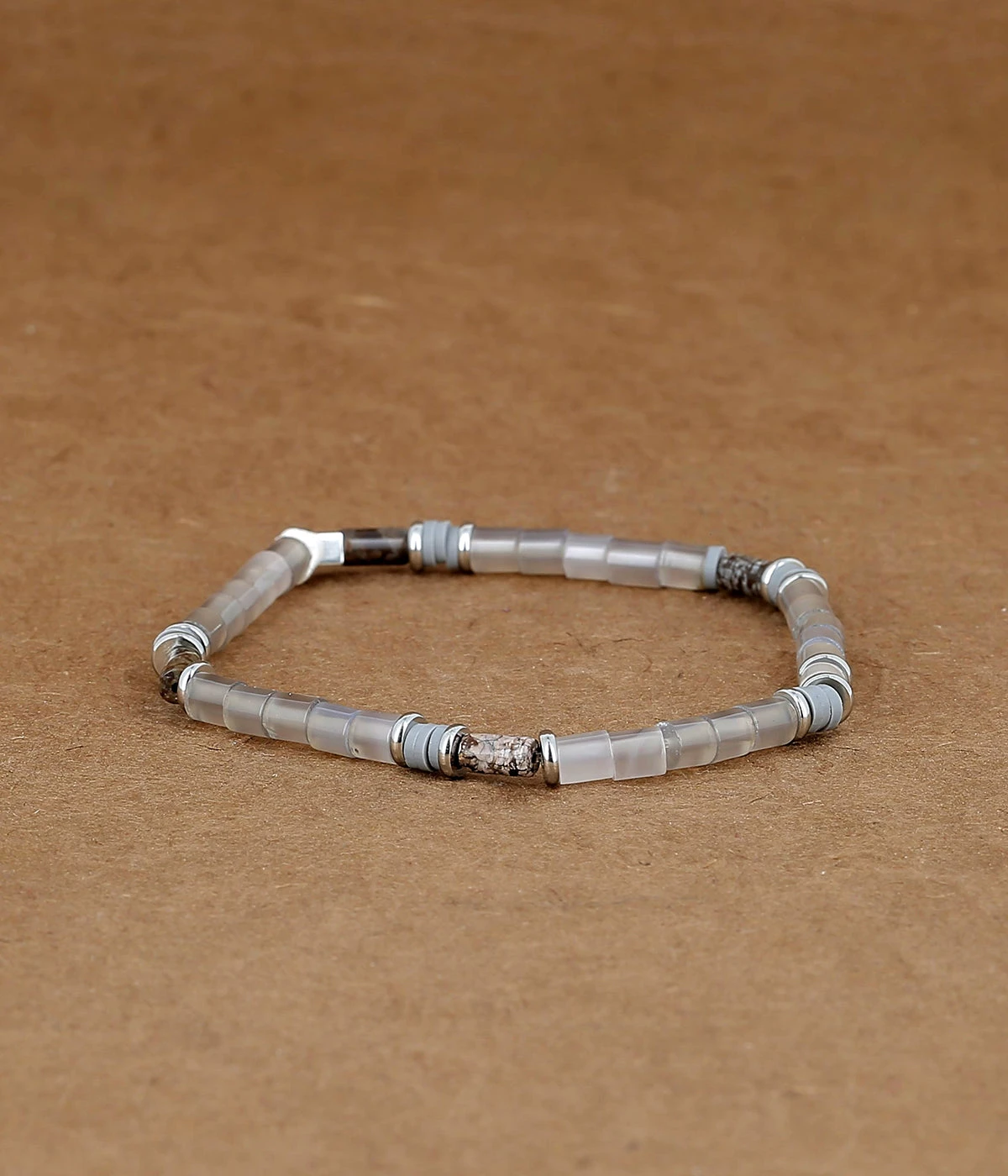 Bracelet élastique sur lequel sont enfilées des pierres colorées.
