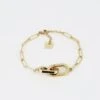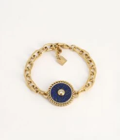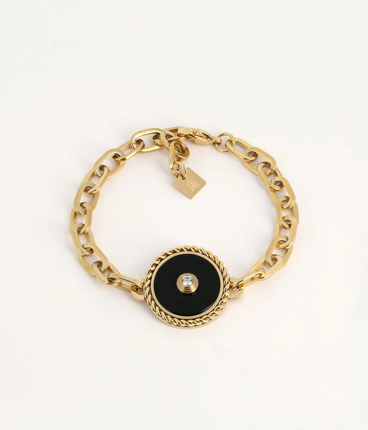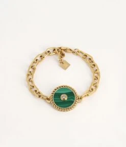 Bracelet maillons en acier dorĂ© Ă l’or fin sur lequel est attachĂ© un mĂ©daillon serti d’une pierre naturelle piquĂ© d’un zirconium serti en son centre.