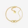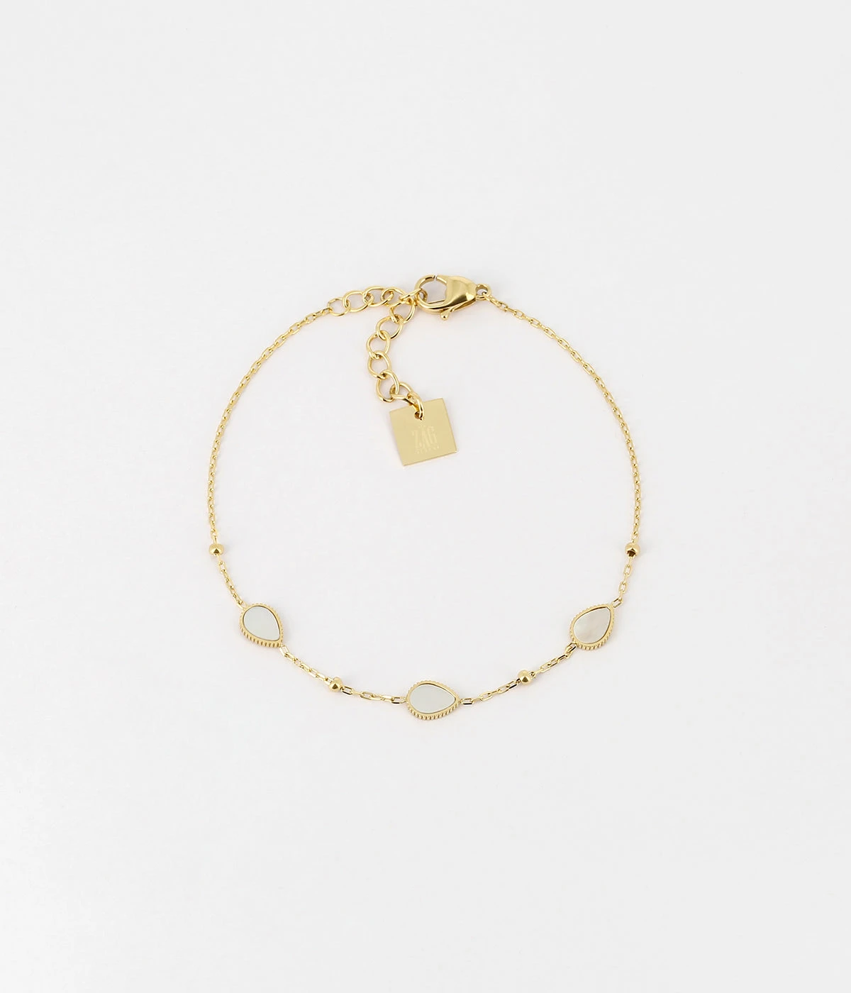 Bracelet en acier dorĂ© Ă l’or fin. Trois motifs en forme de goutte en acĂ©tate colorĂ© sĂ©parĂ©s par des petites boules dorĂ©s se suivent.