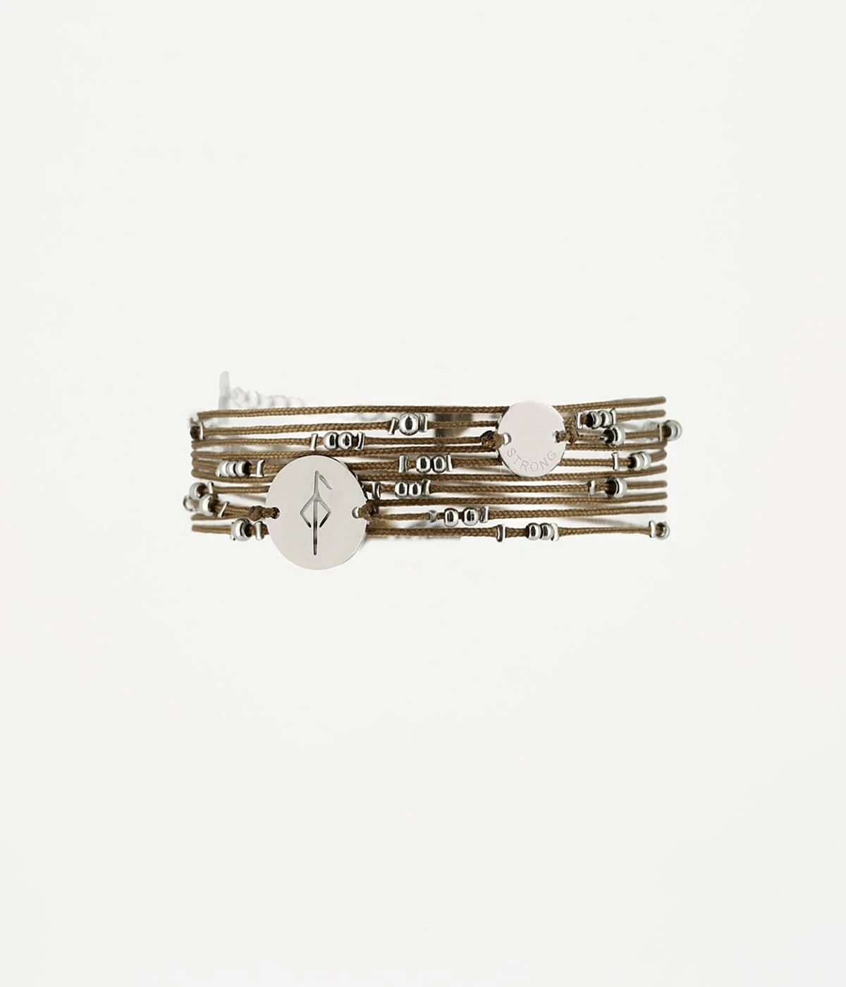 Bracelet cordons sur lesquels sont enfilĂ©es des boules d’acier et des plaques rondes gravĂ©es du mot « strong » et d’une rune.