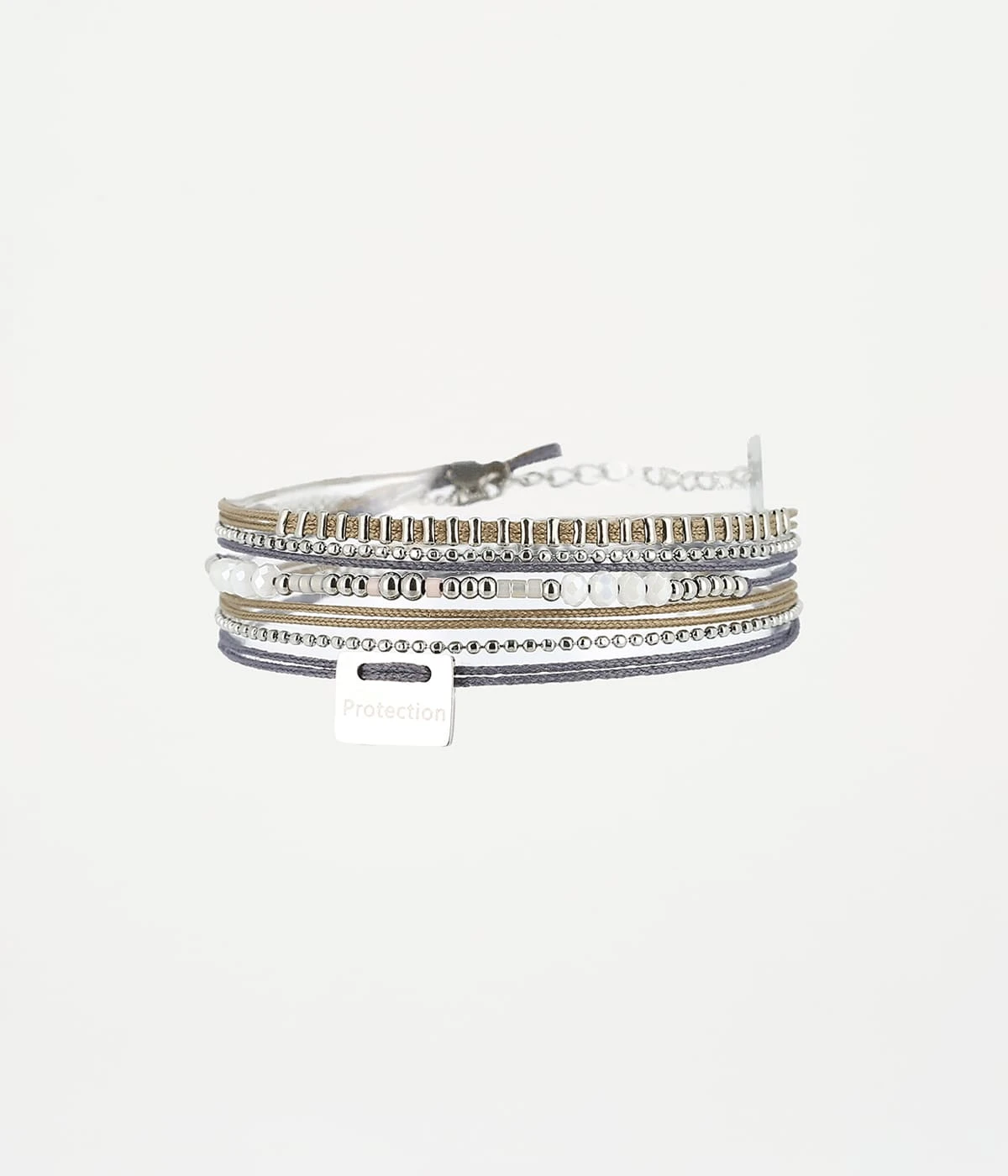 Bracelet multi-rang sur lequel sont enfilĂ©es des perles de pierres fines et un petit carrĂ© de mĂ©tal gravĂ© dĂ©licatement du mot « Protection ». Ce bracelet qui sâentoure deux fois autour du poignet se portera comme un talisman protecteur.
