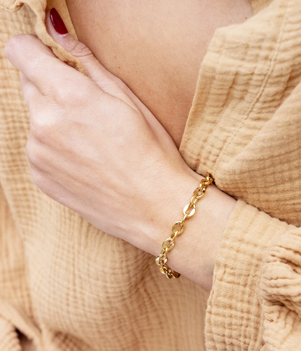 Bracelet en acier dorĂ© Ă l’or fin Ă gros maillons.