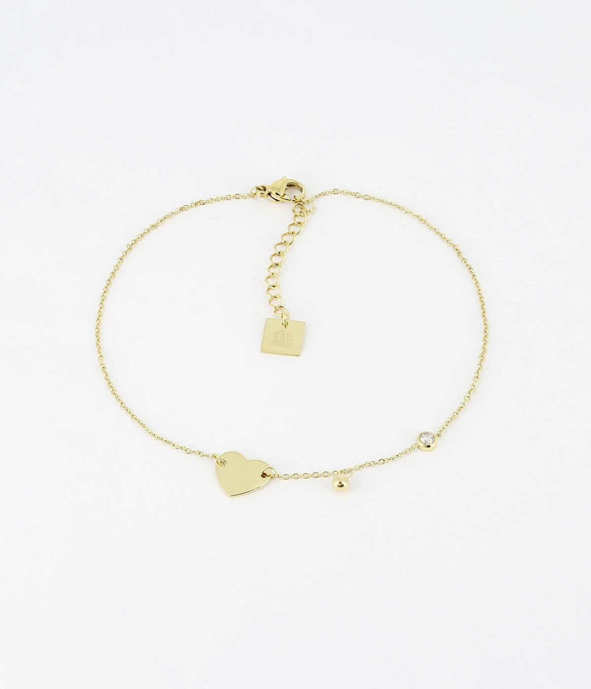 Chaîne de cheville en acier uni ou doré à l’or fin sur laquelle est attaché un délicat motif en forme de cœur et un zirconium en serti clos.