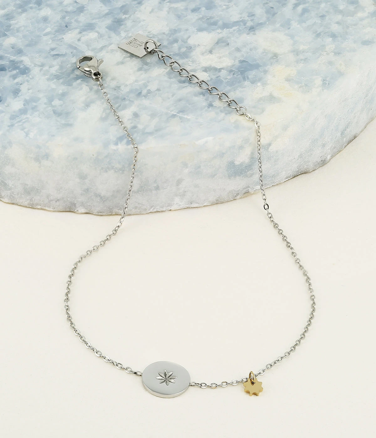 Chaîne de cheville en acier uni ou doré à l’or fin sur laquelle se trouve une médaille accompagnée d’une pampille.