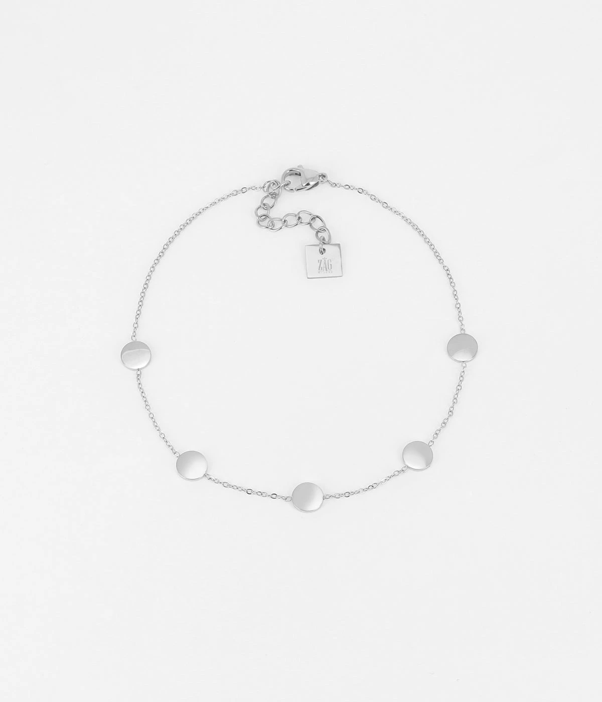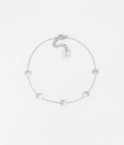 ChaĂźne de cheville en acier uni ou dorĂ© Ă l’or fin sur laquelle sont attachĂ©es des petites pampilles.