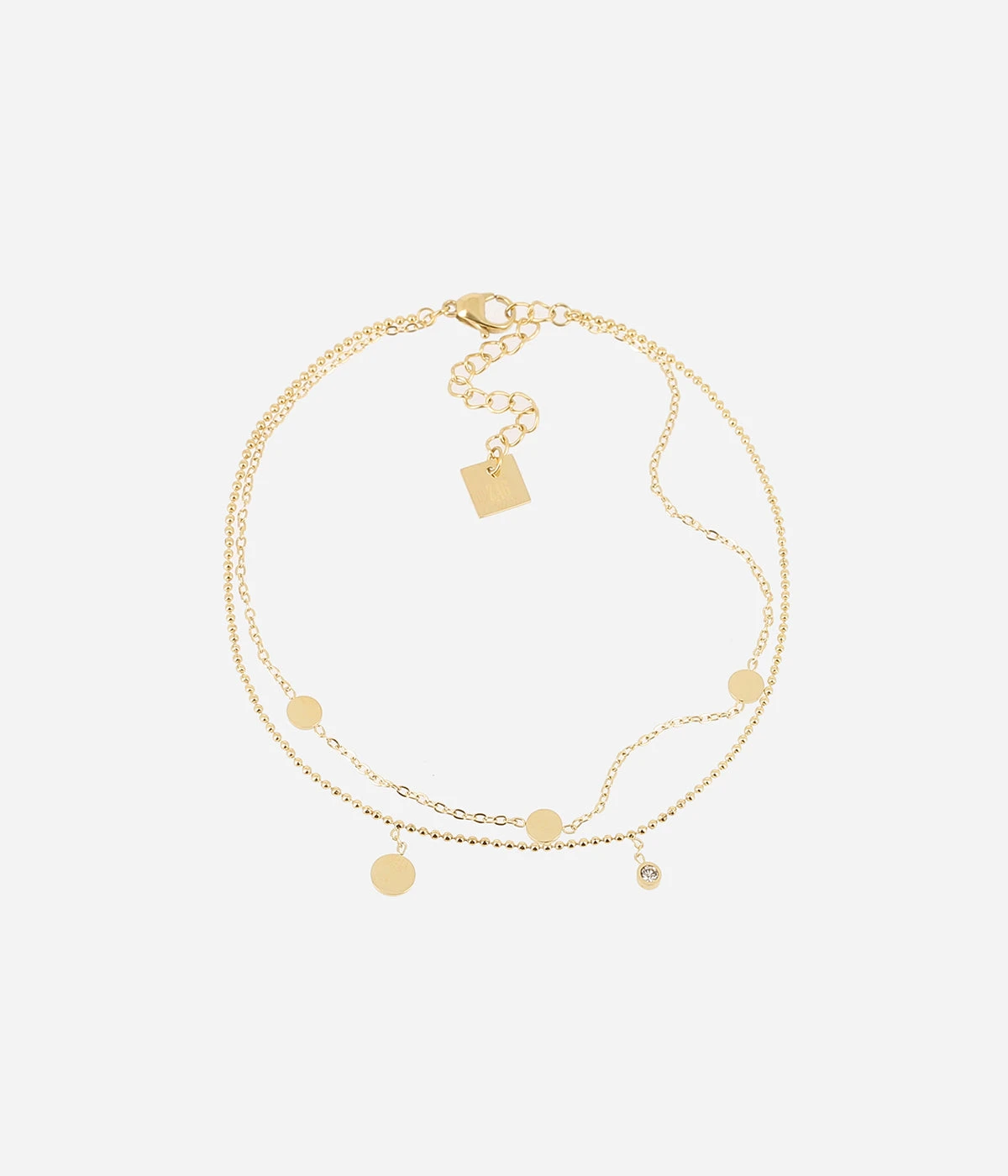 Chaîne de cheville double rang en acier uni ou doré à l’or fin sur laquelle sont suspendues des petites pampilles et des zirconiums.