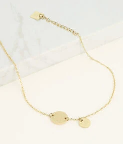 Chaîne de cheville en acier uni ou doré à l’or fin, sur laquelle sont attachées une médaille gravée et une pampille.