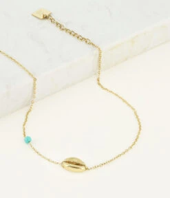 Chaîne de cheville en acier doré à l’or fin sur laquelle se trouve un coquillage en acier doré et une turquoise.