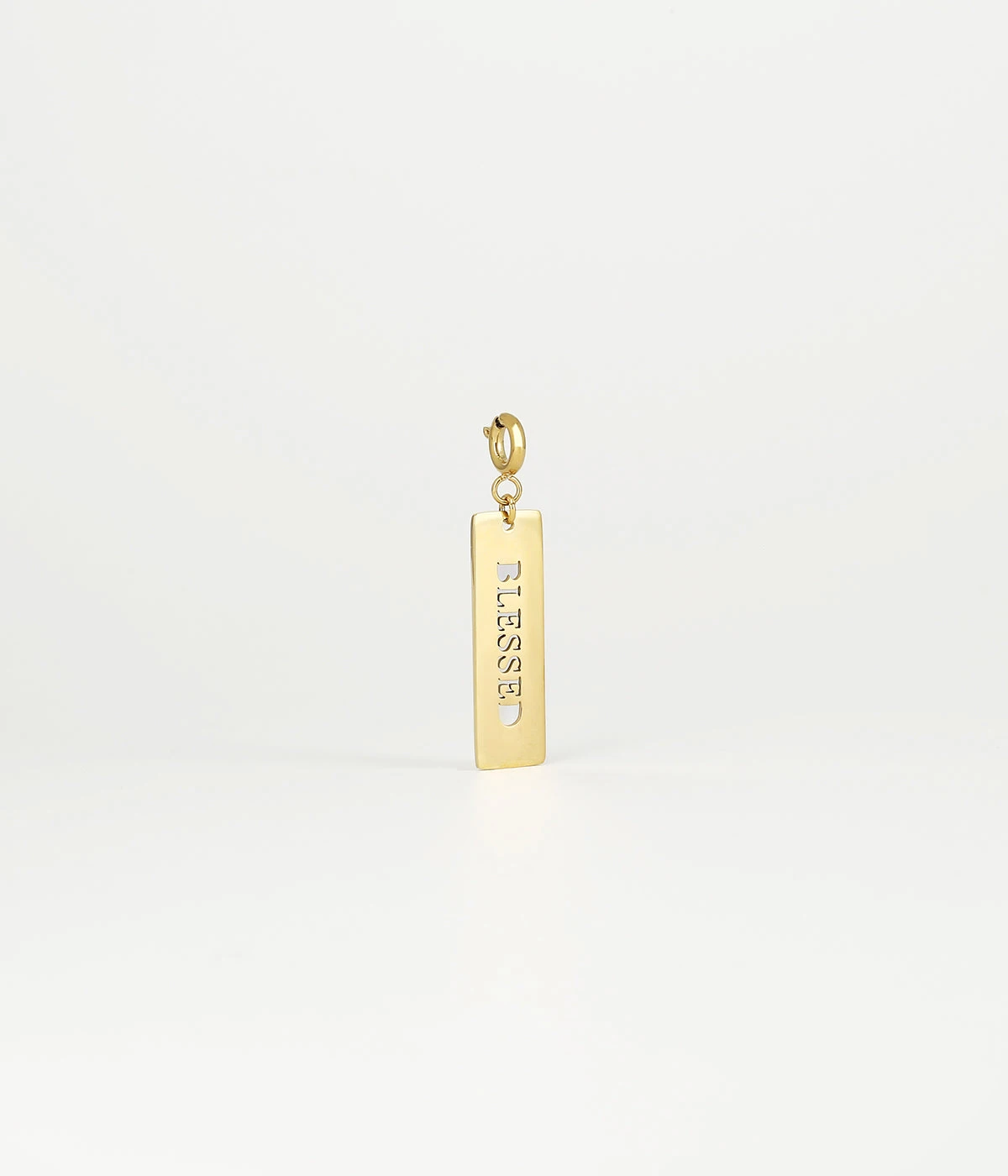 Ce charm en acier dorĂ© Ă l’or fin, se compose d’un mousqueton sur lequel est accrochĂ©e une plaque avec le mot « Blessed » ajourĂ©