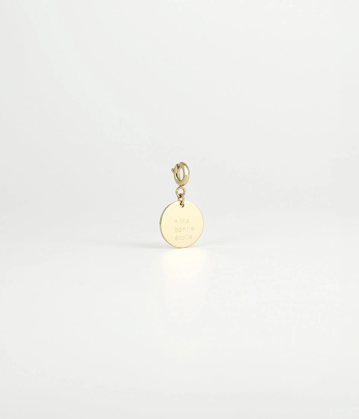 Ce charm en acier doré à l’or fin, se compose d’un mousqueton sur lequel est accroché une médaille gravée du message « Ma bonne étoile ».