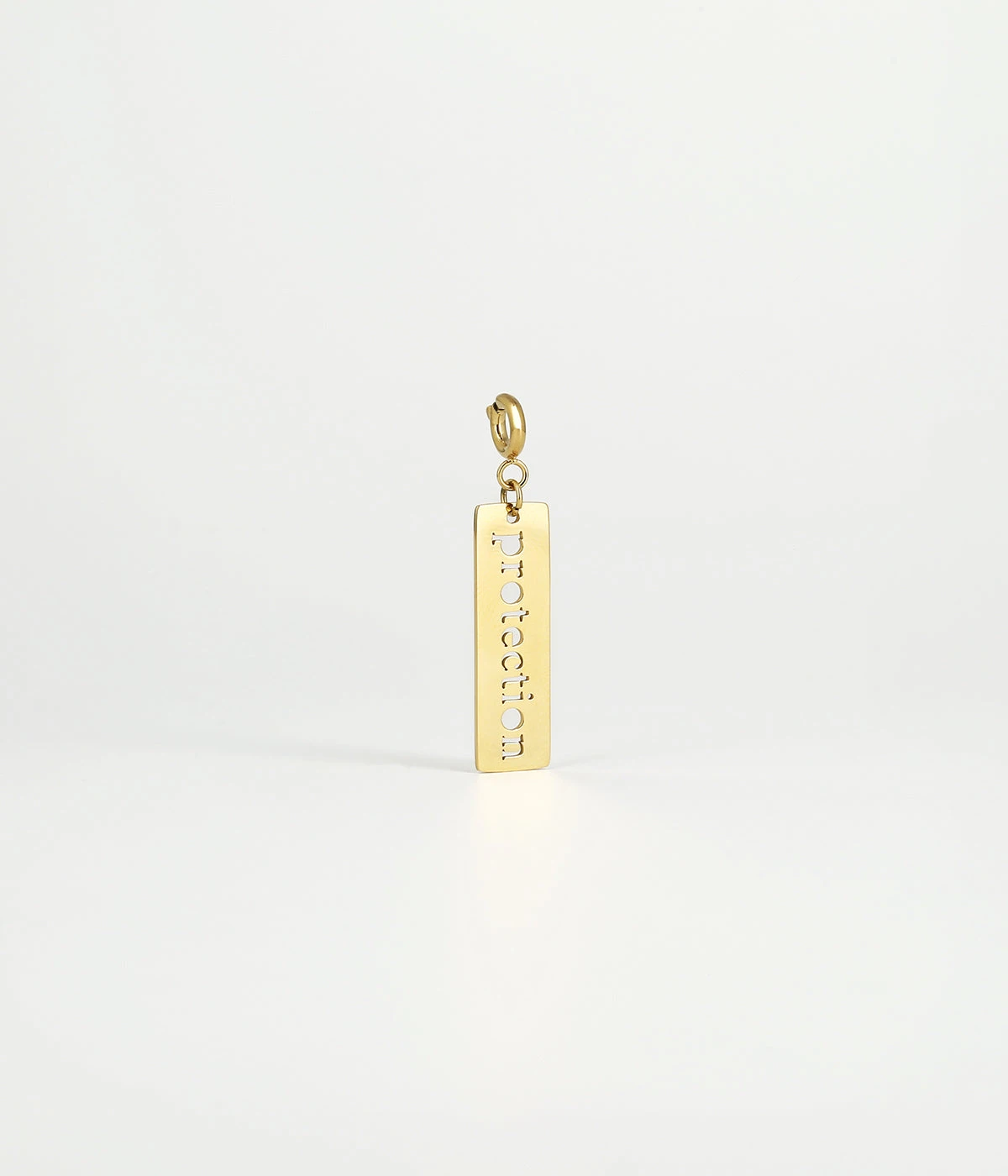 Ce charm en acier dorĂ© Ă l’or fin, se compose d’un mousqueton sur lequel est accrochĂ©e une plaque avec le mot « Protection » ajourĂ©.
